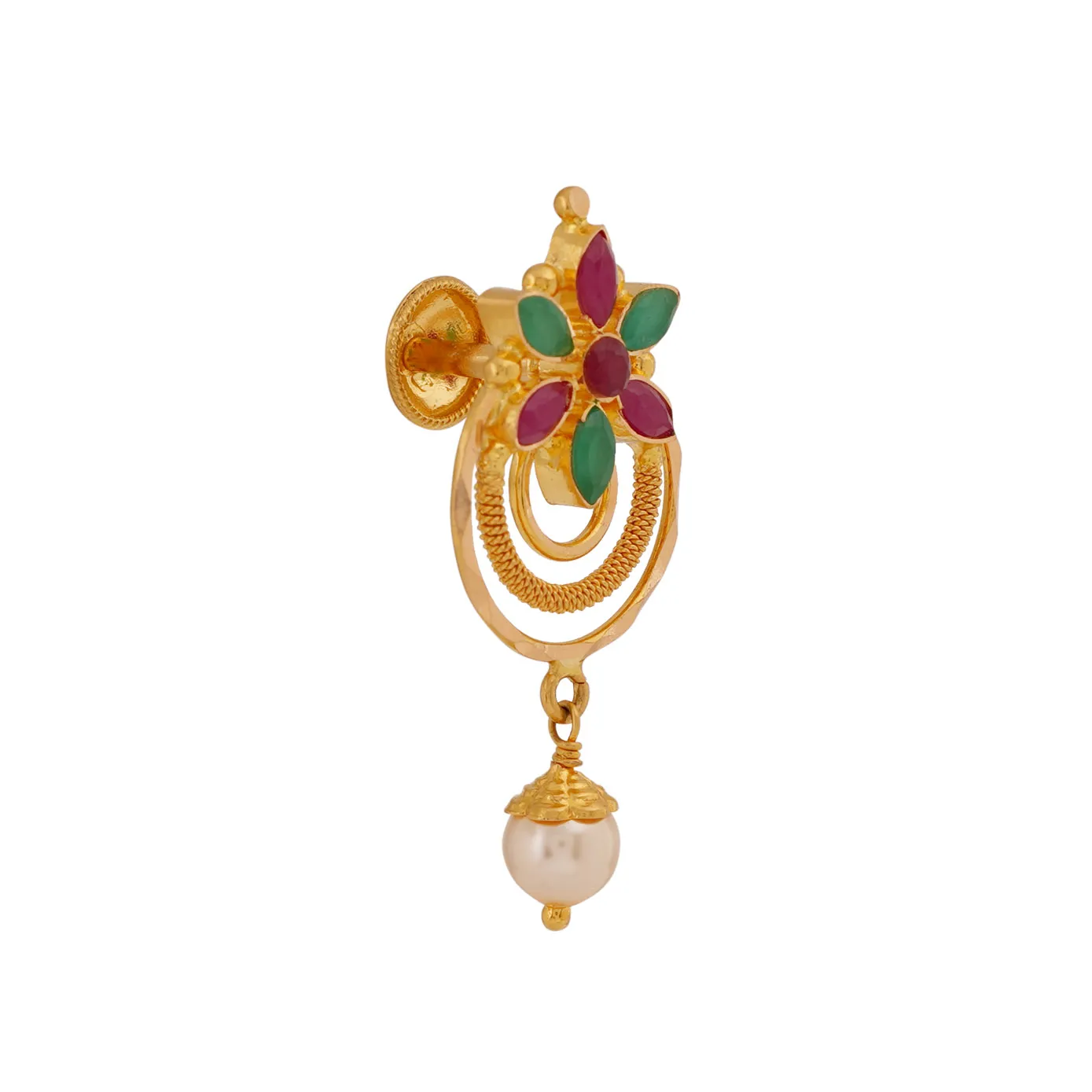 Fascinating layered Chandhballi with floral stud with green and red stones will sure be perfect for both traditional and western styles. These concentric circular drop earrings are crafted with 22k gold with pearl dropping.