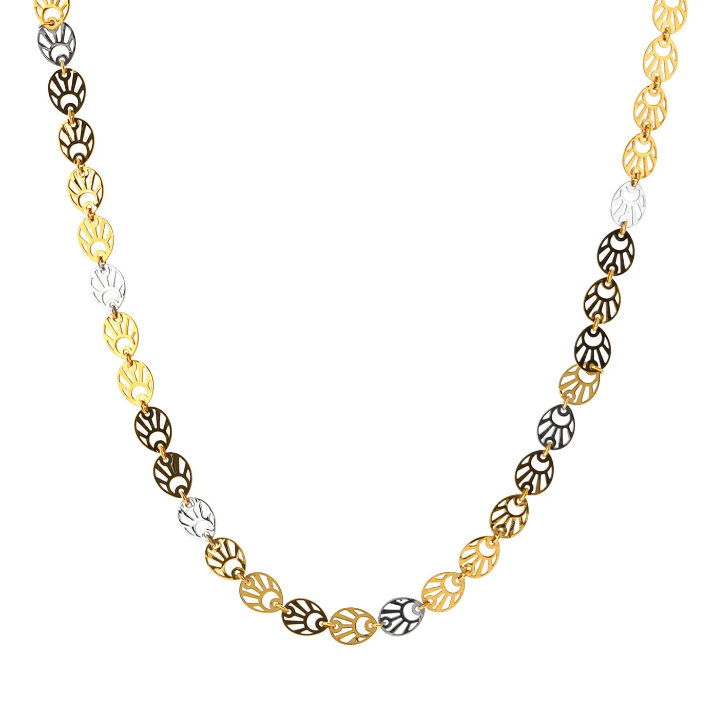 A fancy cut, thin plated chain that has three different gold colors to make a different geometric pattern with black, yellow and rhodium finishes on it to show how uniquely patterned he is.