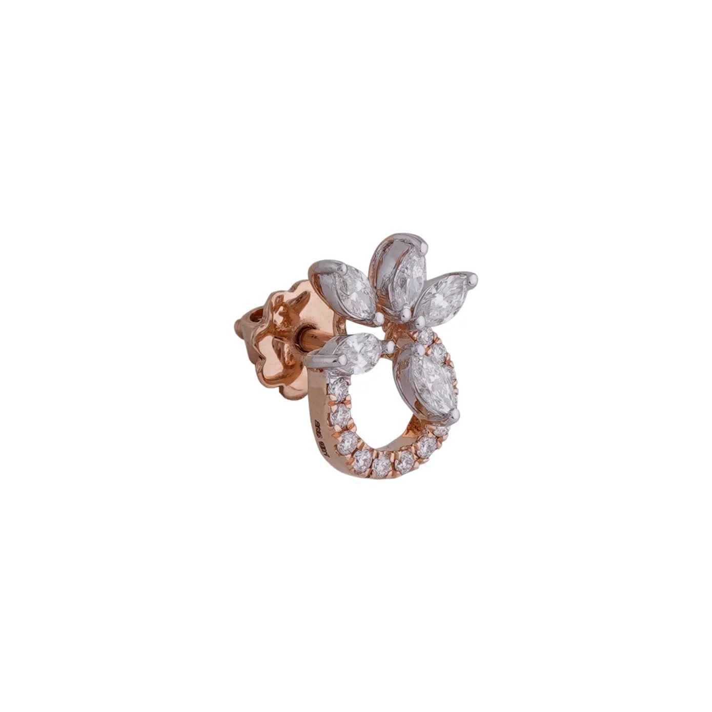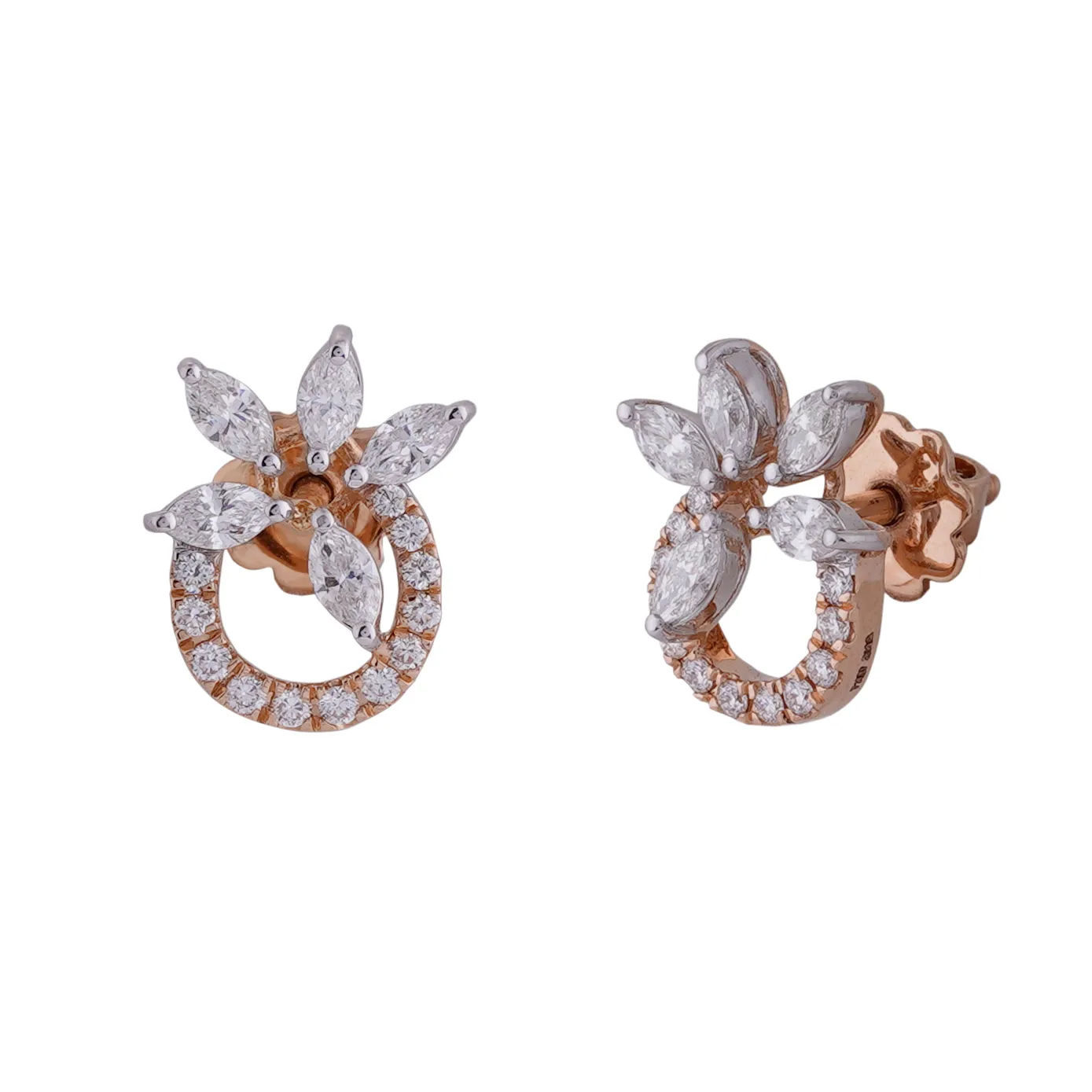 Adorn yourself with the exquisite elegance of our flower-shaped diamond earrings studded on 18k Rose Gold. Each earring features a radiant marquise-cut diamond at its heart, delicately encircled by a brilliant ring of smaller diamonds. This unique design captures the beauty of nature's bloom while exuding a timeless and captivating sparkle, making these earrings a perfect blend of sophistication and charm.