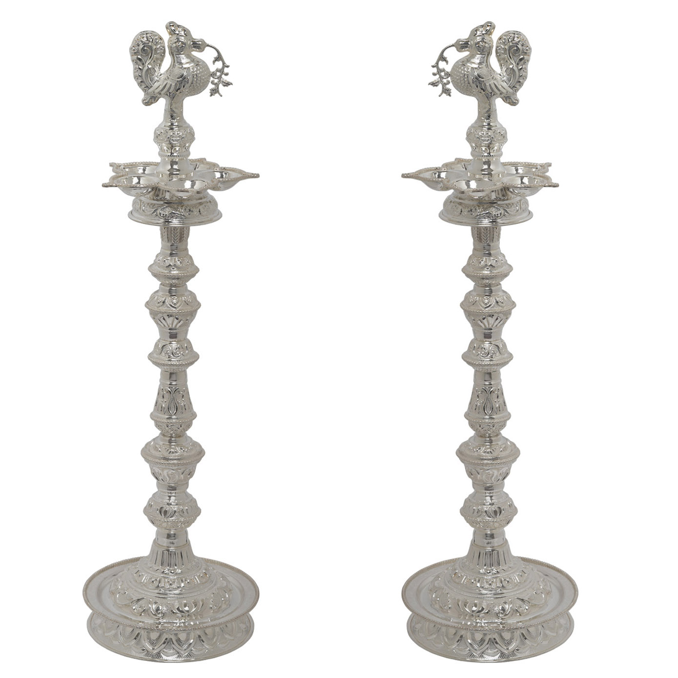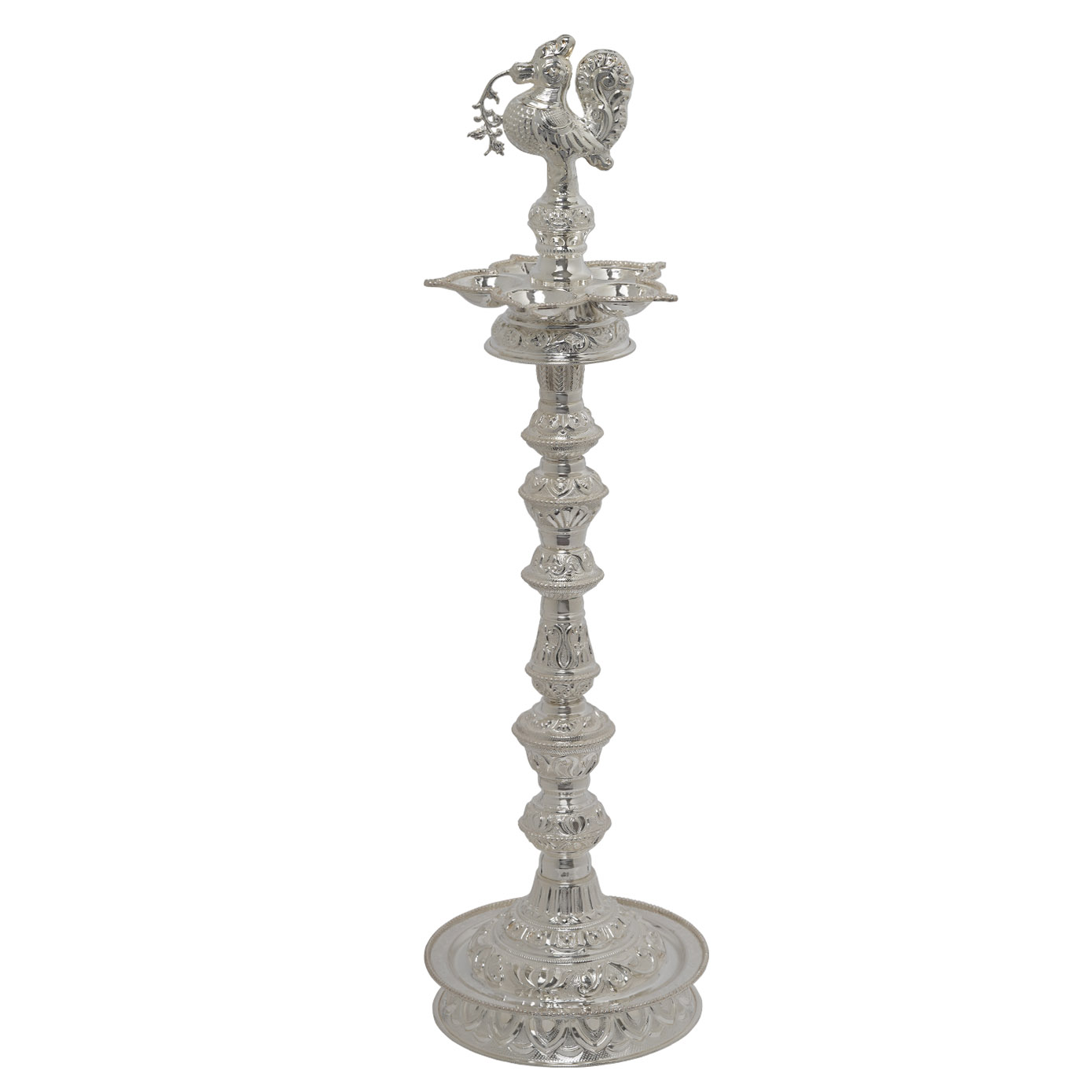A uniquely designed Nangu Vizhaku to decorate your pooja room and make the divine energy surpass your soul. The vilaku with five separate faces to hold its light with an annapakshi head holding a flower vine to it. The stem relates to differently shaped lobes carved with several designs and the heavy base hold the entire setup with ravishing details to it.