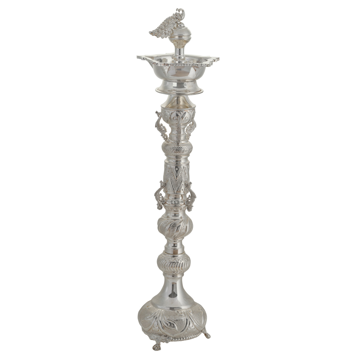 An extravagantly curated heavy moulded Nagas Kuthu Vizhaku topped with amazingly modelled peacock with even small detailing’s to be seen clearly on a five faced lamp. The stem of this beauty is carved with even more details that makes an grandeur appearance studded with finely carved feathers to it. The bottom of the Kuthu Vizhakku is designed in a manner of rounded dom shape and three legs to it as a stand.