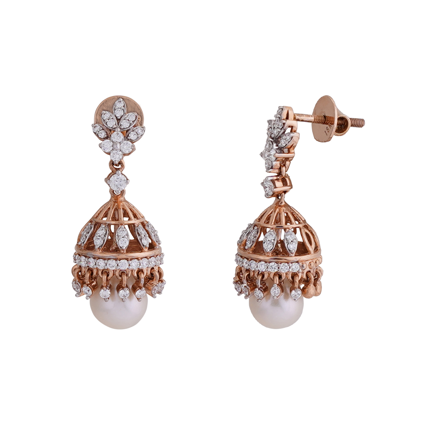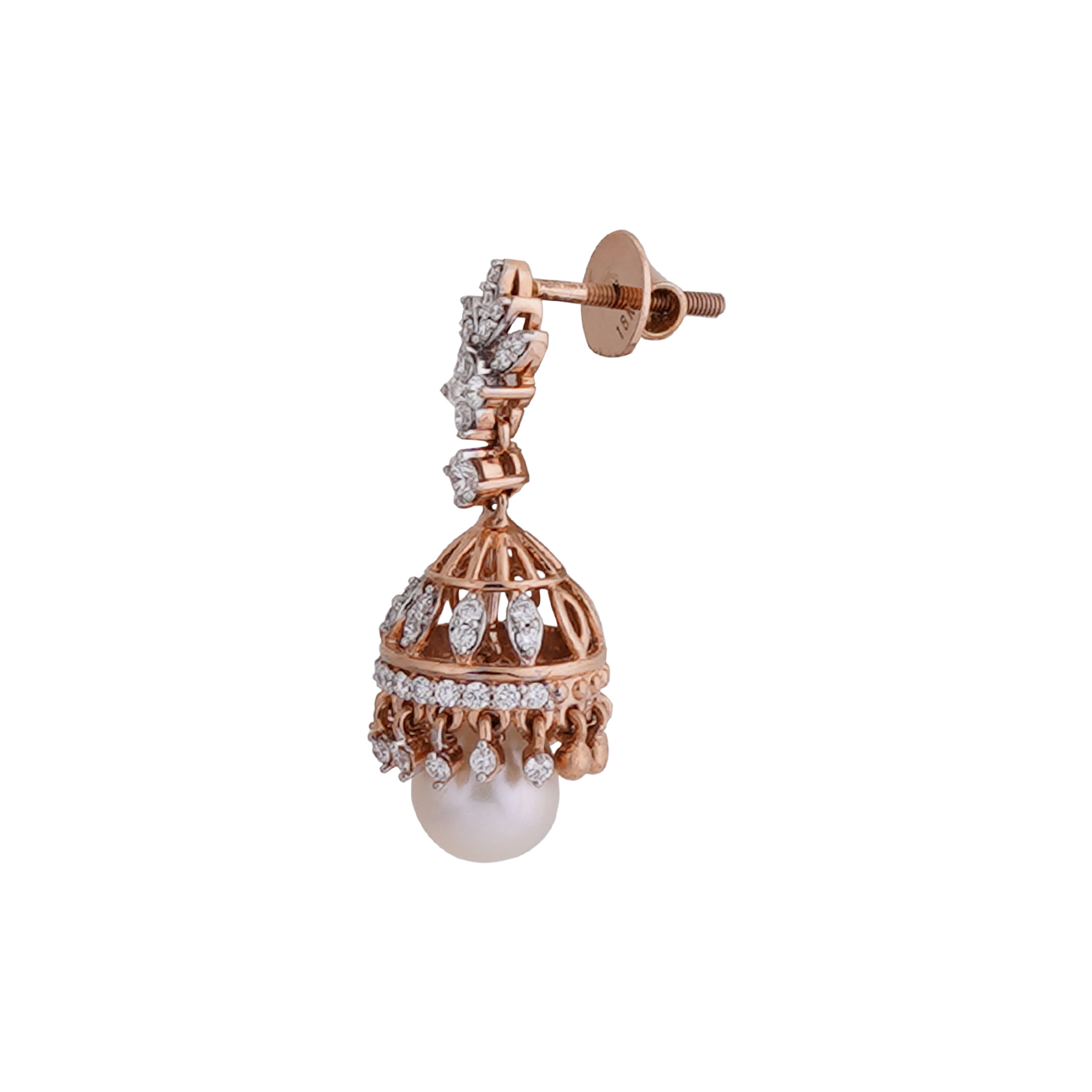 Elevate your style with our exquisite Jumka, a captivating fusion of elegance and opulence. This alluring piece features a mesmerizing cluster of diamonds, carefully set in lustrous 18k rose gold. Adorning the bottom is a magnificent mega pearl, adding a touch of timeless charm. Designed to command attention, this Jumka is the perfect accessory for women who appreciate the finer things in life and wish to infuse their attire with a touch of sophistication and grace.