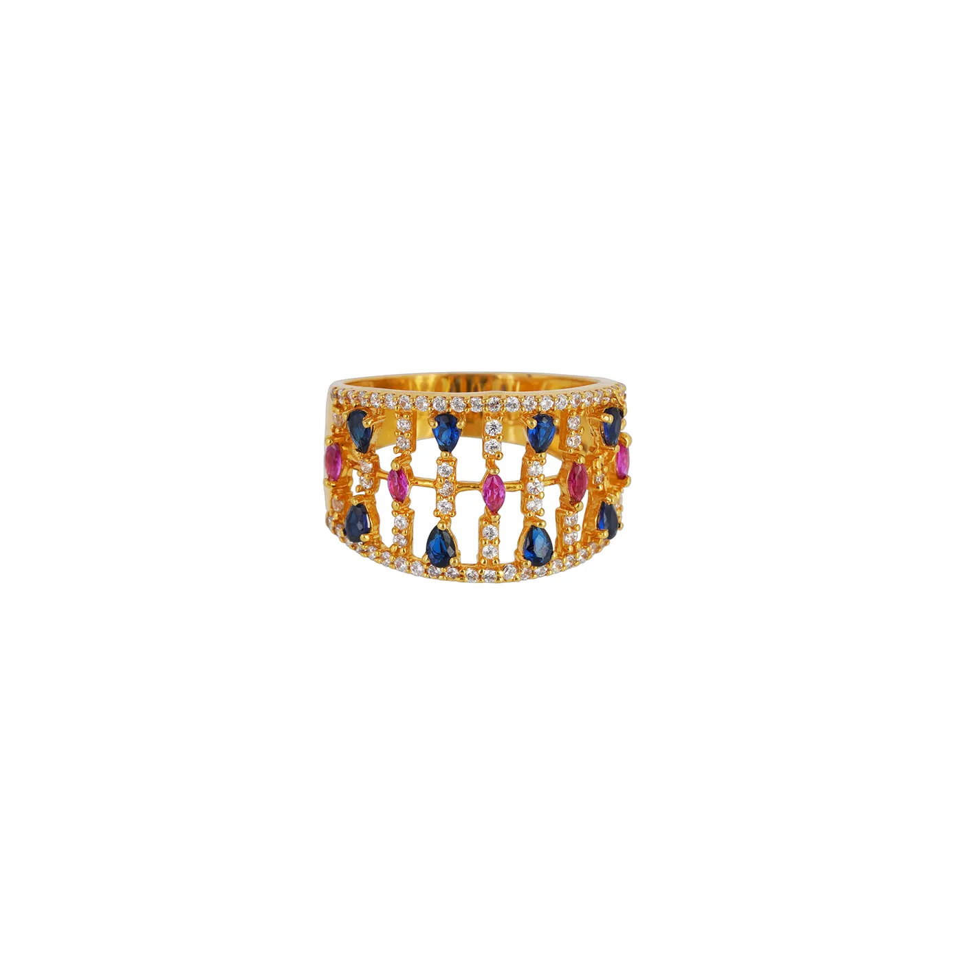 A grand cocktail ring with multiple color stones added to it with multiple channels on it to communicate its sophistication all the way through its every ounce.