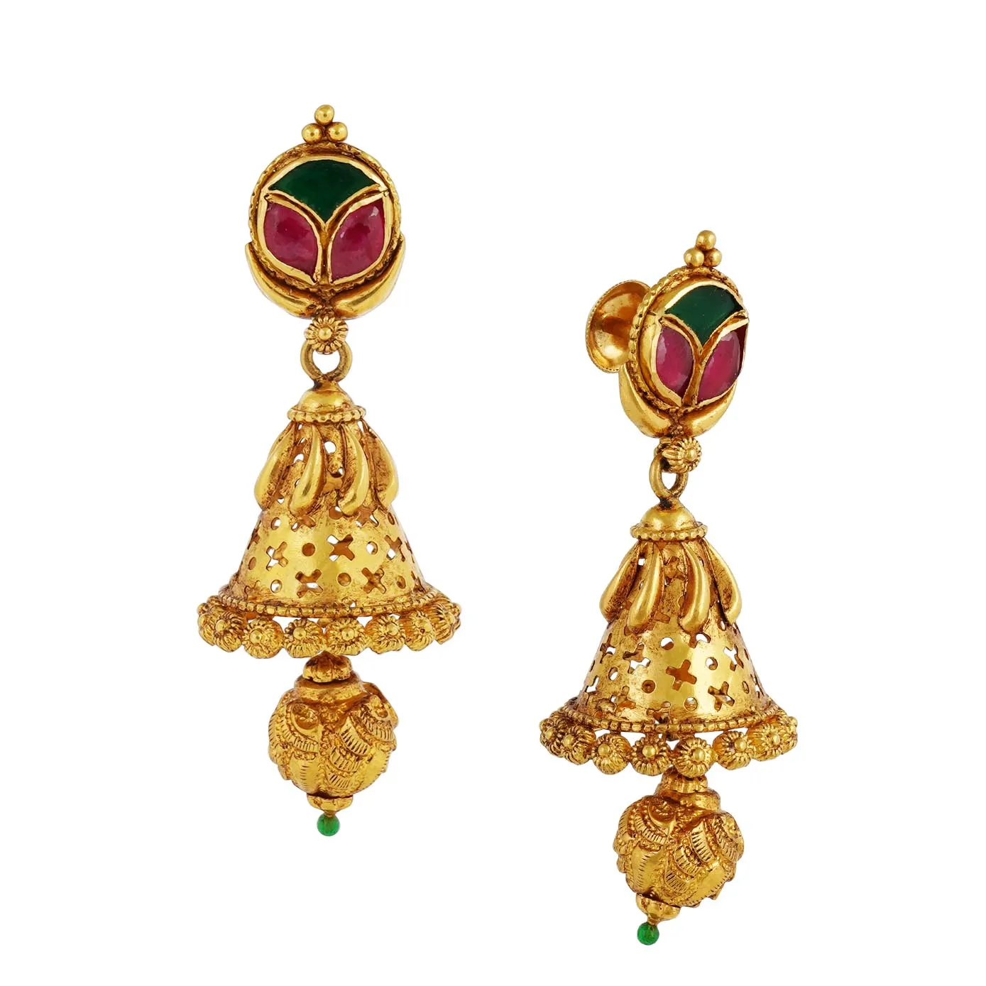 A colorful enamel added to the jumkka top in a simple design fastened to a bell shaped jumkka. The jumkka is designed with special cuts and floral petals, the jumkka ended with circular rims on it. finally the golden bead is added finally to it.
