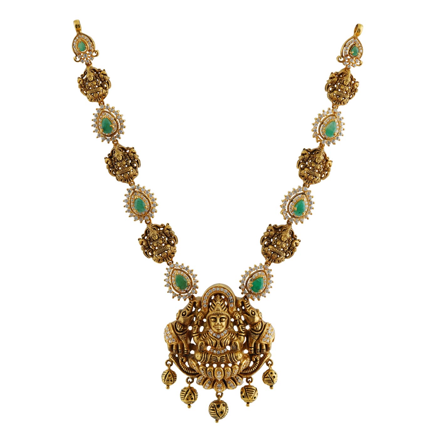 Bask in the magnificence of our grand Lakshmi motif necklace, a masterpiece of opulence and intricate detailing. This regal piece showcases the revered Lakshmi motif, each form adorned meticulously with closely set zircon gemstones, forming a river of shimmering brilliance. The addition of lush green semi-precious stones accentuates the goddess's grace with a touch of nature's beauty. As you wear this necklace, you're enveloped in a sense of divinity and splendor, with the Lakshmi motif representing prosperity and the zircons and green stones symbolizing radiance and abundance.