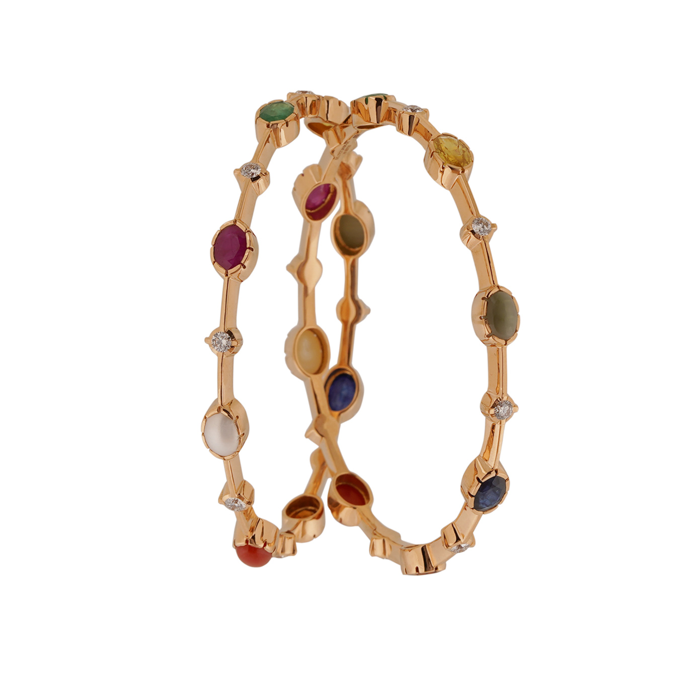 Behold the divine symphony of timeless elegance and celestial significance with the ANS Dhivyam Jewels' masterpiece – the exquisite Navarathna Bangle. Meticulously crafted with unparalleled precision, this bangle is a celestial dance of nine precious gemstones, each embodying cosmic energies and cultural richness. The calibrated alignment of the radiant Navarathna gemstones, coupled with the unparalleled purity of diamonds, transforms this creation into a wearable masterpiece, a testament to the artistry and craftsmanship that defines ANS Dhivyam Jewels. As you adorn this bangle, let the harmonious blend of gemstones bestow upon you not only the brilliance of diamonds but also the mystical aura of Navarathna, weaving a tale of tradition, spirituality, and unmatched sophistication.