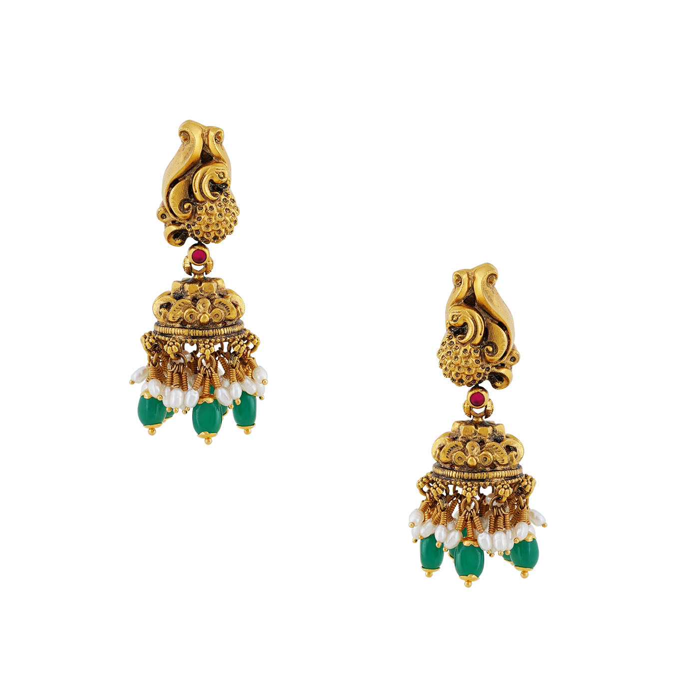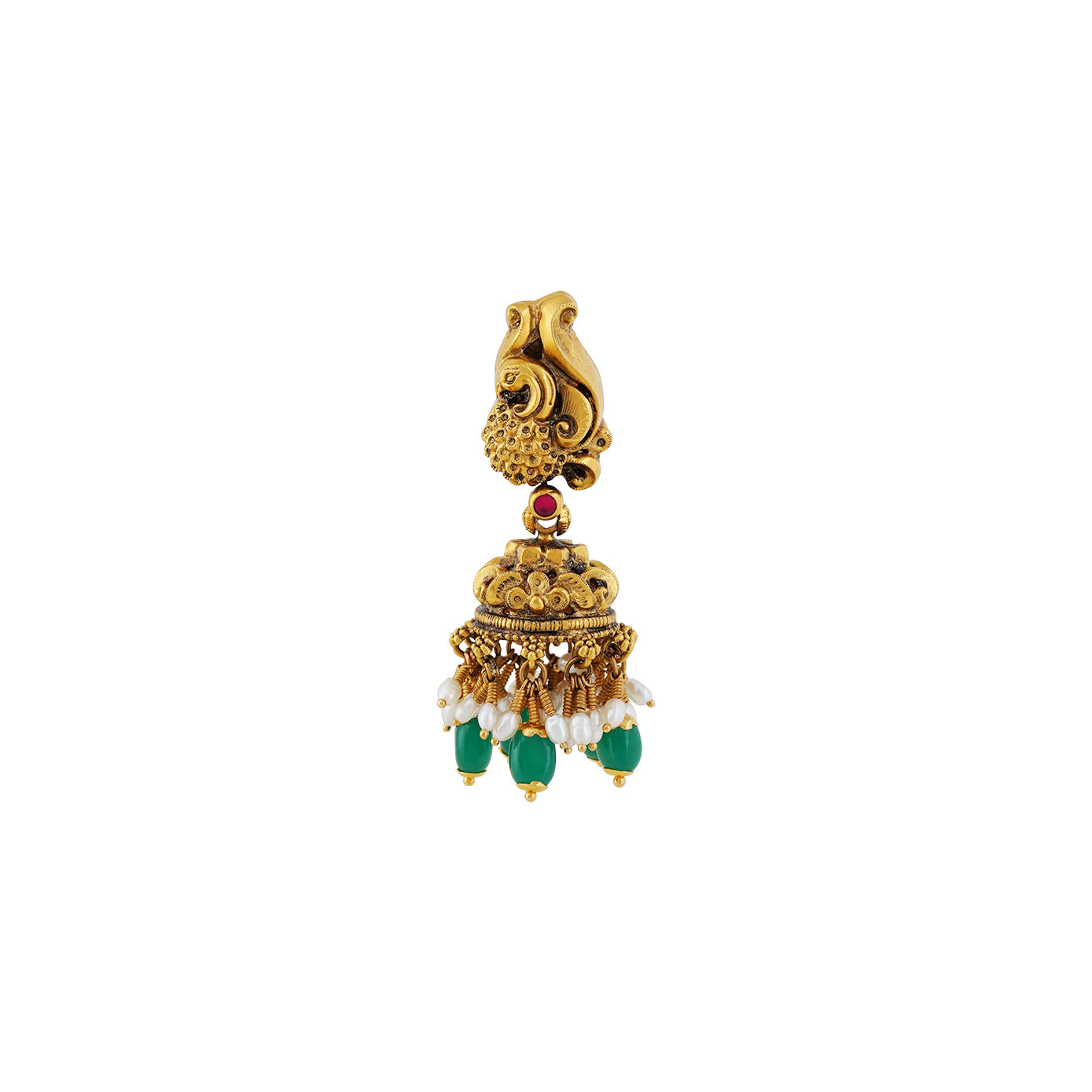 "Golden Elegance Takes Flight: Embrace the allure of tradition with this exquisite 22kt gold jumkka. The Anna Pakshi top adds a touch of grace, while the deep Nagas model intricately weaves cultural richness. Finished with pearls and green beads, this jumkka is a symphony of traditional charm, echoing the beauty of timeless heritage."
