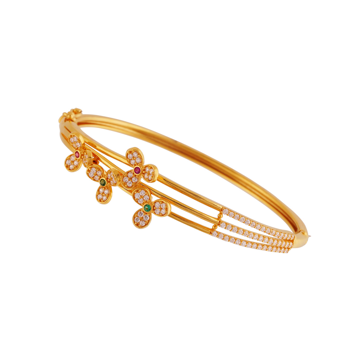 Introducing our stunning bangle bracelet for women, adorned with a captivating floral pattern that exudes timeless elegance. Each delicate petal and leaf is meticulously crafted to create a mesmerizing bouquet of beauty, accented with sparkling zircons and color stones that complement your daily attire flawlessly. Whether you're dressing up for a special occasion or adding a touch of sophistication to your everyday look, this bracelet is the perfect accessory to elevate your style with its exquisite craftsmanship and versatile design. Let the enchanting floral motif wrap around your wrist, adding a touch of feminine charm and effortless glamour to any outfit.