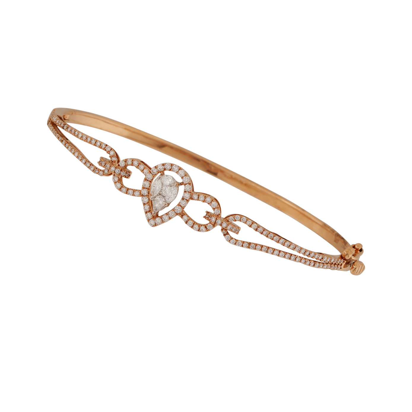 Indulge in the timeless allure of this 18kt rose gold bracelet, adorned with exquisite carvings that evoke a sense of delicate beauty and craftsmanship. At its heart lies a captivating lotus motif, meticulously studded with shimmering diamonds that glisten with celestial radiance. Each detail is a testament to the artistry and elegance embodied in this enchanting piece, making it a symbol of grace and sophistication. Wear this bracelet as a cherished adornment, reflecting the beauty of nature and the brilliance of fine craftsmanship.
