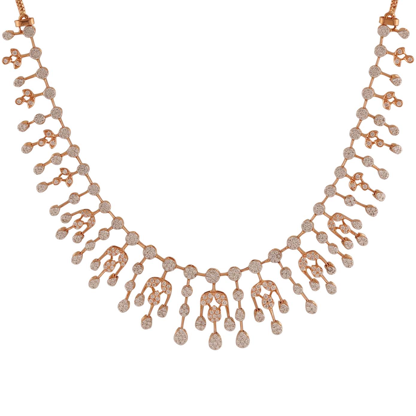 "Indulge in the timeless elegance of our floral wine necklace from ANS Dhivyam Jewels, crafted in 18kt rose gold and exquisitely studded with shimmering diamonds. This breathtaking neck piece features delicate drop-shaped motifs that enhance its sophisticated design, creating a stunning floral pattern. Perfect for complementing any outfit, this versatile necklace effortlessly combines classic beauty with contemporary flair, making it an essential addition to your jewelry collection. Whether for special occasions or everyday glamour, this diamond-studded masterpiece promises to elevate your style with unmatched grace and brilliance."