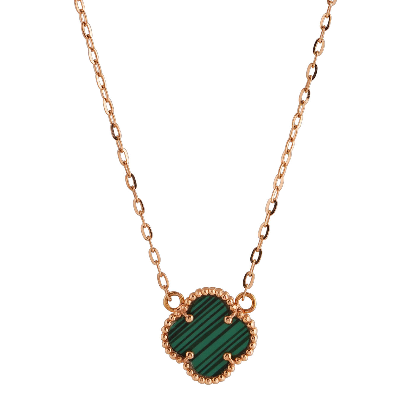 "Achieve your fashion goals with our 18kt rose gold chain and pendant from ANS Dhviyam Jewels. The pendant features a charming four-leaf clover design with a vibrant green resin center, symbolizing luck and elegance. The pendant is suspended from a delicate, lightweight paperclip-style chain, offering a contemporary twist on a classic look. Perfect for everyday wear or special occasions, this stunning piece combines modern design with timeless charm, making it an essential addition to your jewelry collection."
