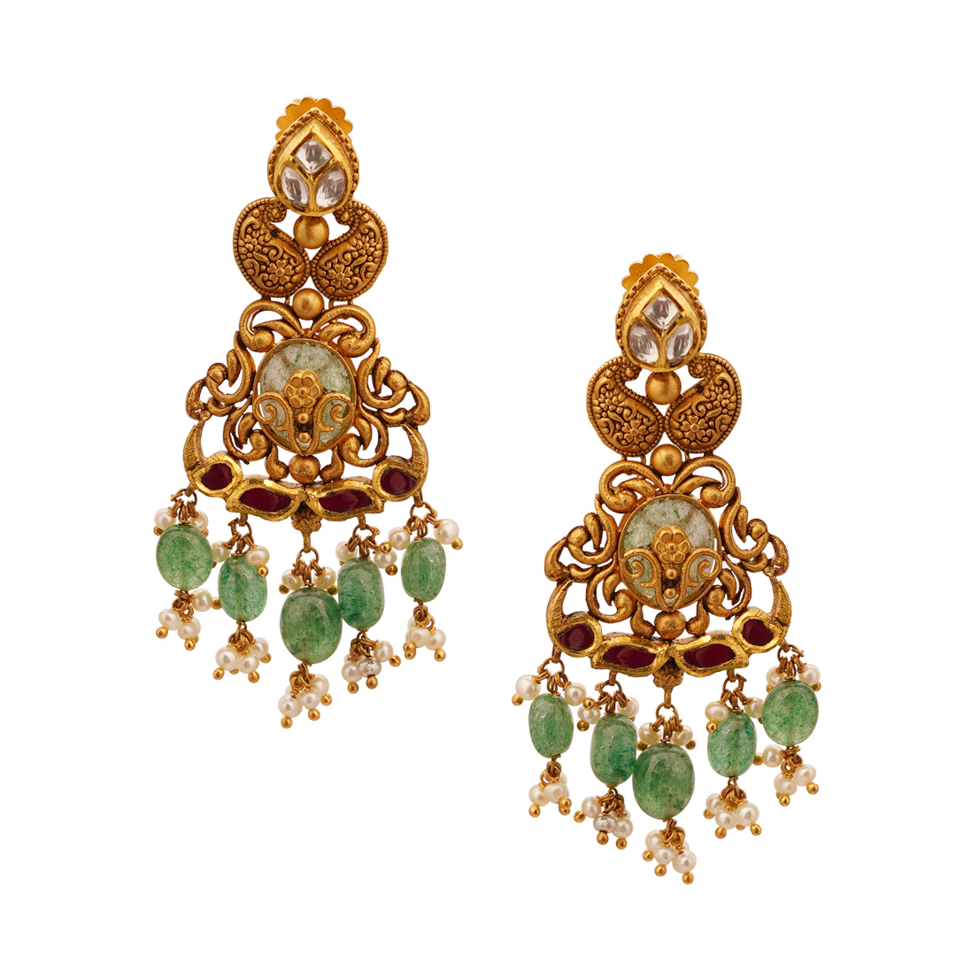 Elevate your ethnic ensemble with this exquisite 22kt gold mini choker, a masterpiece blending traditional motifs and modern finesse. The top layer features a striking circular motif adorned with delicate filigreed work, setting a sophisticated tone. Cascading below are lush mango motifs, each bursting with intricate floral filigree that captures nature's bounty in pure gold. At the base of every mango hangs a slender layer of vibrant red jadau kundhan, adding a pop of regal color and texture. At the heart dangles a captivating central pendant, cradled by a precious jade green stone framed in ornate filigreed patterns— a symbol of prosperity and timeless allure. The design culminates in a third layer of lustrous pearl loreals interspersed with semi-precious oval-shaped green jade beads, creating a harmonious flow that enhances the necklace's multi-dimensional elegance. Perfect for weddings, festivities, or as a statement piece for everyday luxury.