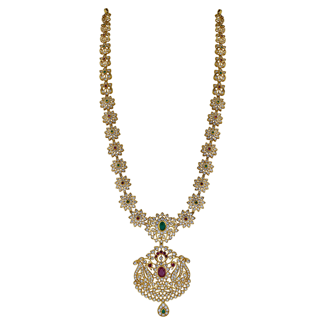 This exquisite Diamond Design Zircon Haram showcases a graceful floral vine pattern, crafted to bring out timeless elegance and refined beauty. High-quality zircon stones are meticulously arranged in an open-close setting, allowing enhanced brilliance and superior light reflection from every angle. The haram is beautifully finished with an ornate pendant, highlighted by rich accent stones that add a regal touch to the overall design. The delicate floral flow combined with intricate craftsmanship makes this piece a perfect choice for weddings, festive occasions, and traditional celebrations.