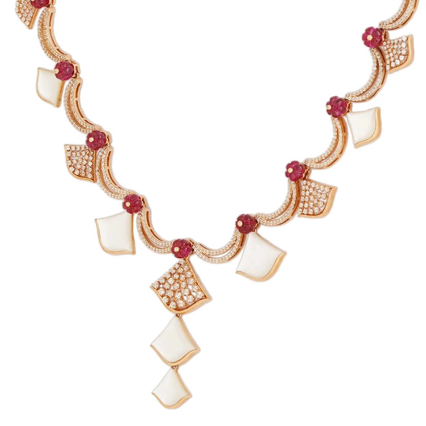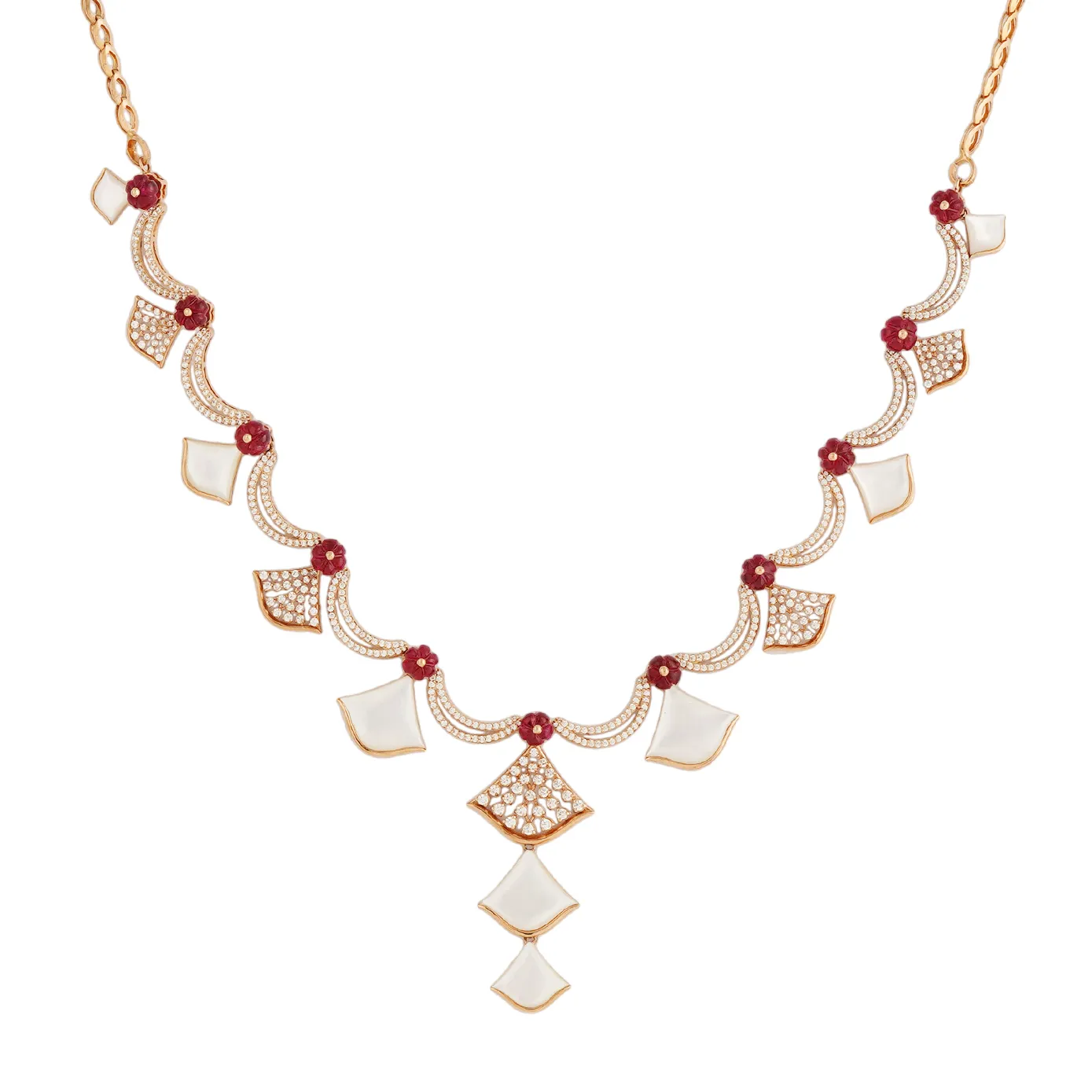 All eyes will stuck on your appearance with this Mother Of Pearl contemporary collection studded with red stones on 18k rose gold. Be the Centre of attraction with our ANS Dhivyam’s exclusives.