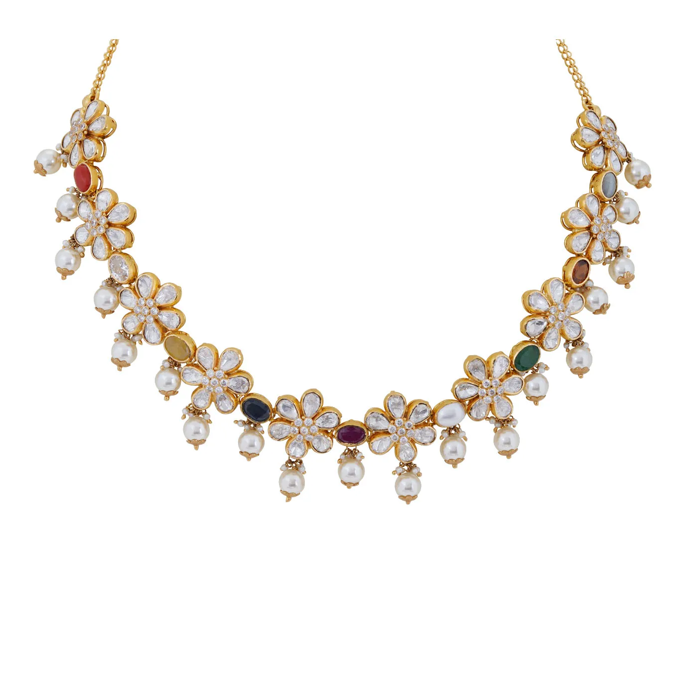 A soothing radiance with polki stone floral necklace adorned all over with navarathna stones. A blend of those stones and pearl drops to highlight the whole beauty crafted in 22k gold.