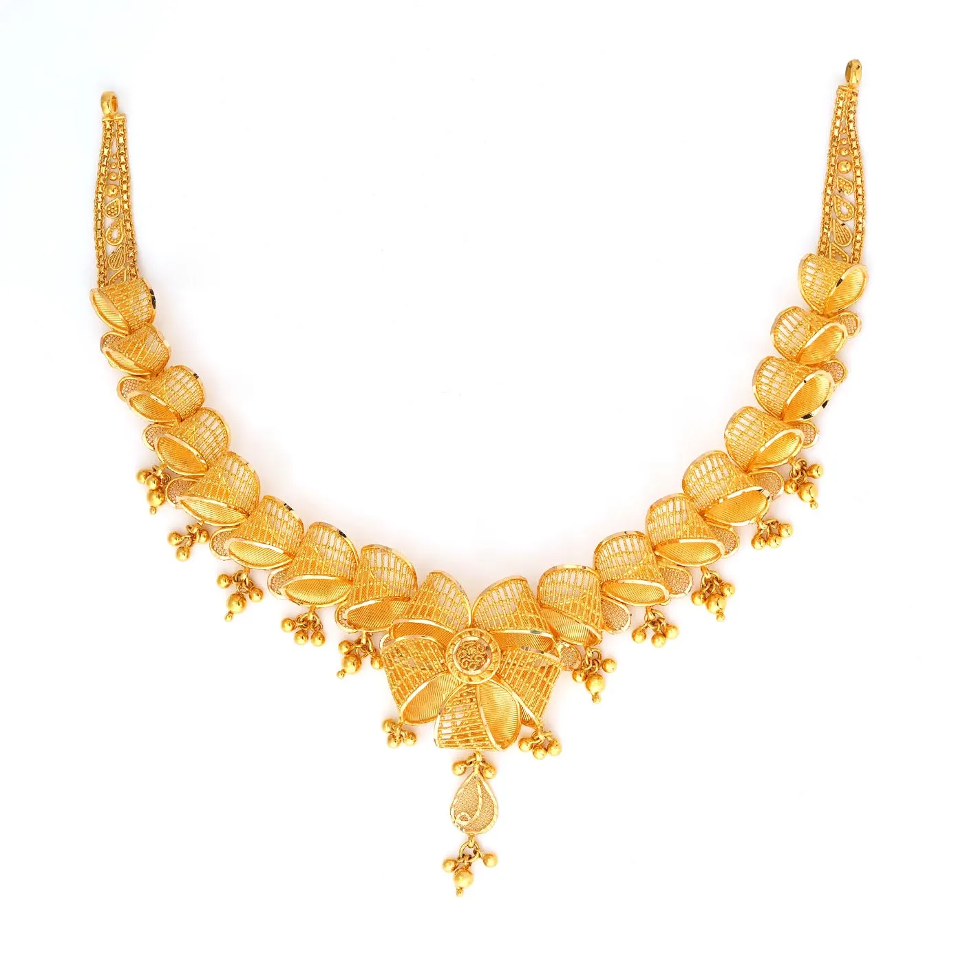 A filigreed Muhalai necklace to elevate your traditional outfits that is made using 22k gold with intricate wirework or threads of gold, that are twisted and braided together to create a lacy, openwork design. Showcase your intricate beauty with this beautiful and unique decorative Calcutta Necklace which features your beauty.