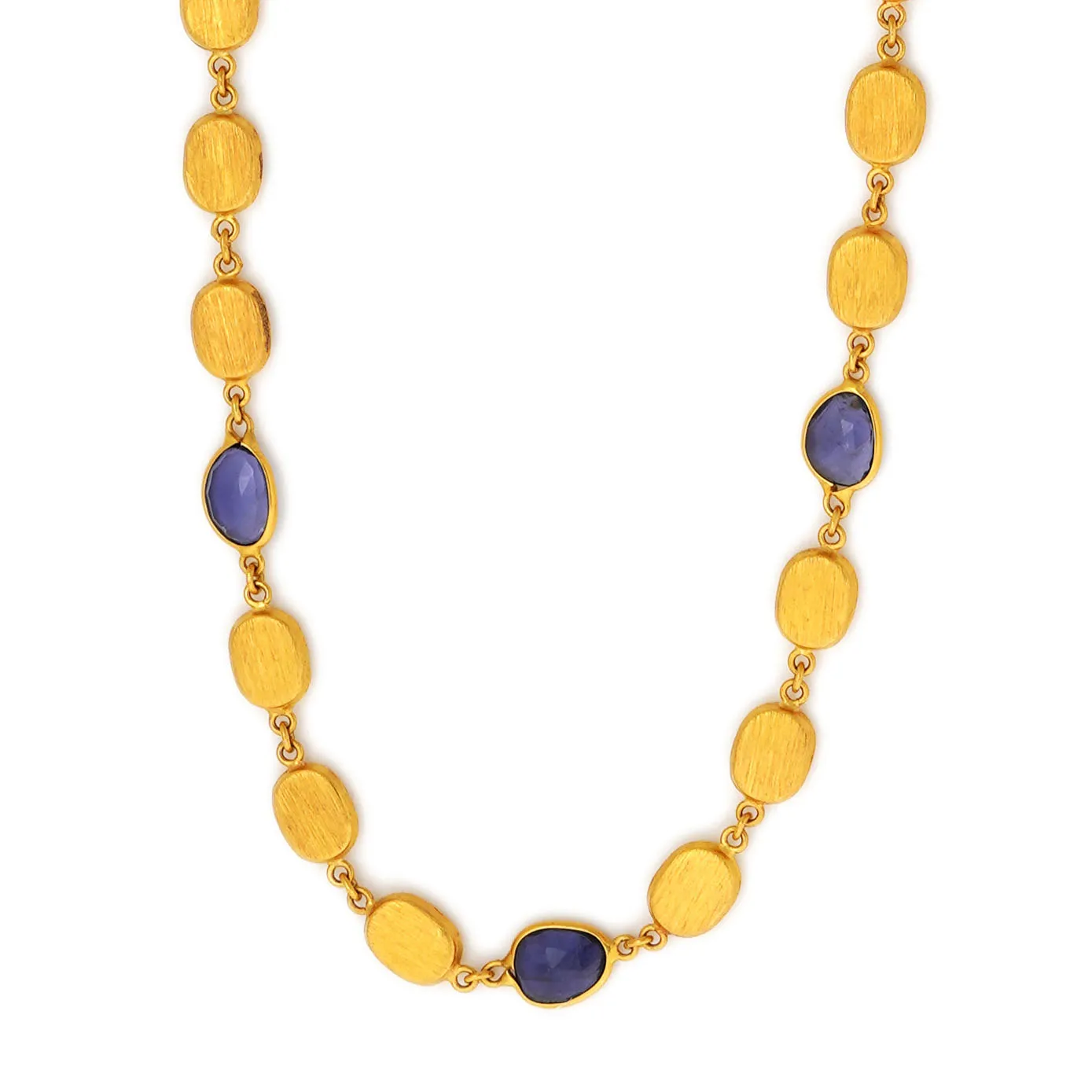 Embellish and enrich yourself with an astonishingly patterned neck chain with blue sapphires and specially textured gold beads interlocked with each other and when you pair it up with all your fashion outfits and showcase yourself as a fashionista.