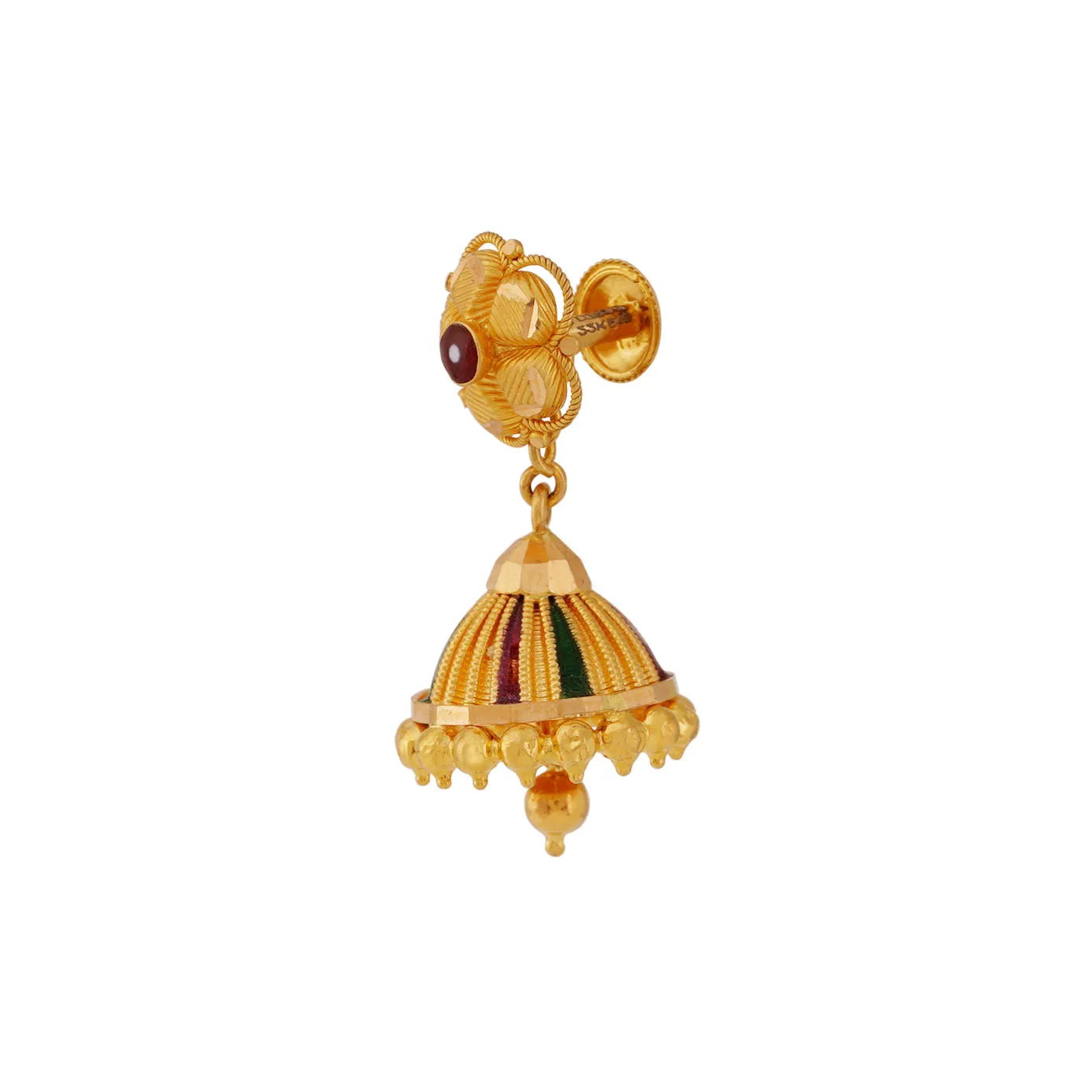 Check out this traditional yet stylish classic jumkka with floral top and golden beads drop and intricately designed and enameled with colors. This 22 karat classic jumkka is specially designed to women who gets confused to choose a matching earring to your ethnic ensembles.