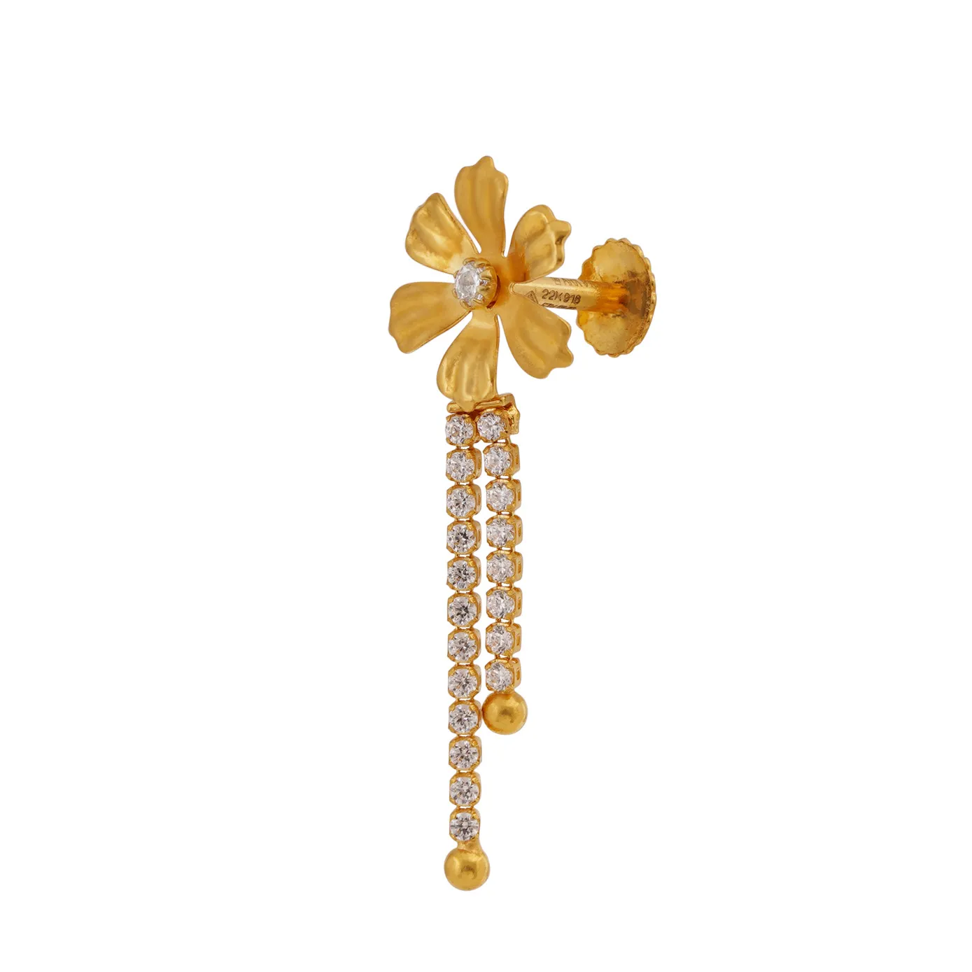 This trendy floral drop earring will work beautifully with all your outfits and suits all occasions. A beautiful floral design studded with zircon in the center and the droppings with stone chain and ended with golden bead designed with 22k gold.