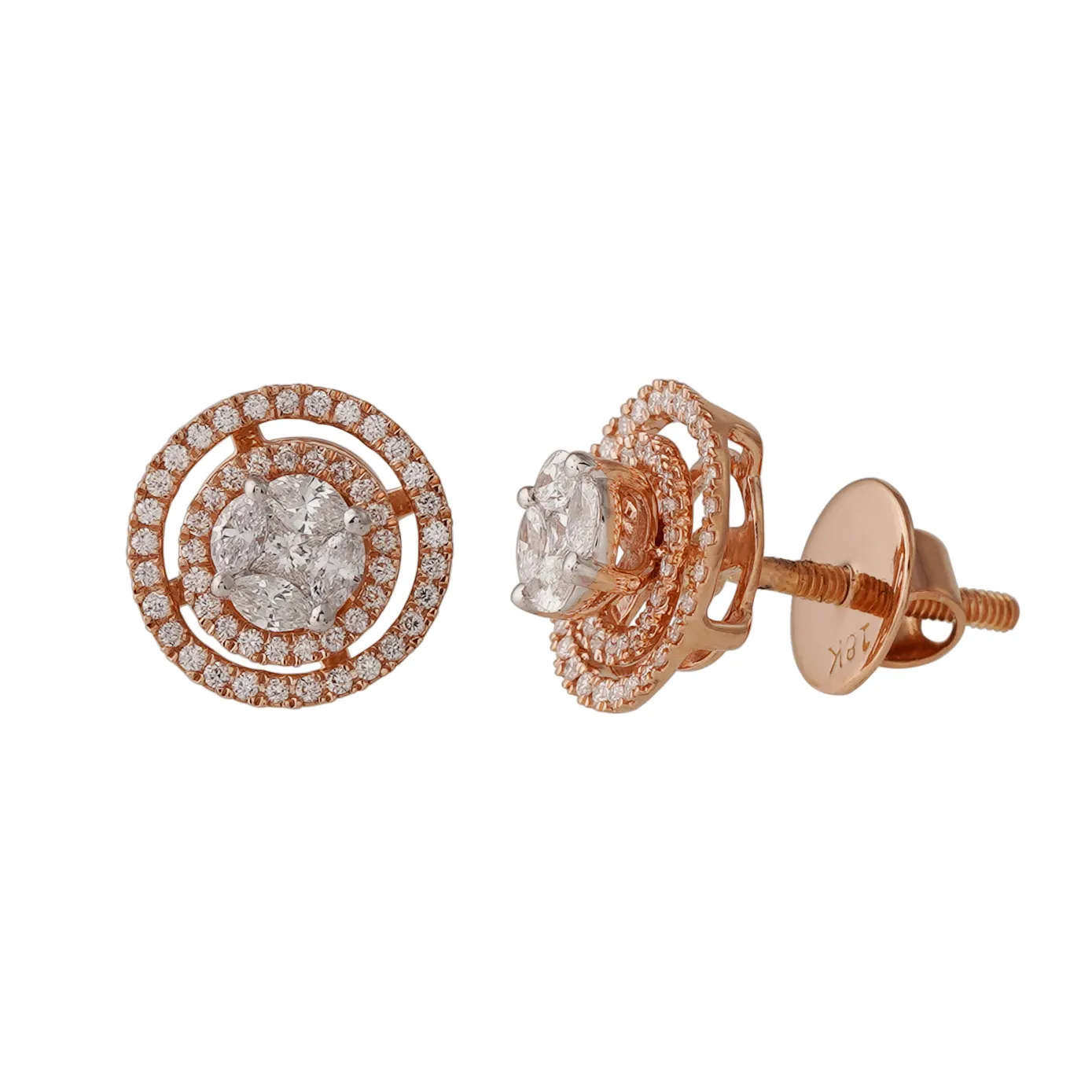 Crafted from lustrous 18k rose gold, the circular frame of this design boasts gracefully arranged spokes that serve as both an aesthetic marvel and a structural embrace. Within this captivating framework, a symphony of dazzling diamonds takes center stage, their brilliance echoing the mesmerizing ripples they collectively form. The intricate interplay of precious metal and radiant gems culminates in a piece that harmonizes elegance and artistry in perfect unison.