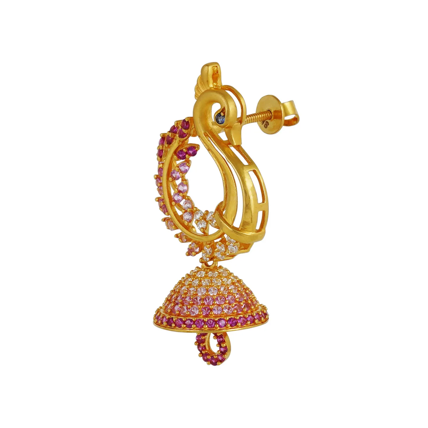 A pretty peacock designed with a pink shaded stones studded within 22k gold. The peacock with beautiful leafy feathers that has a different shade that attract people towards this jummka. The colored stones are arranged in a special way.