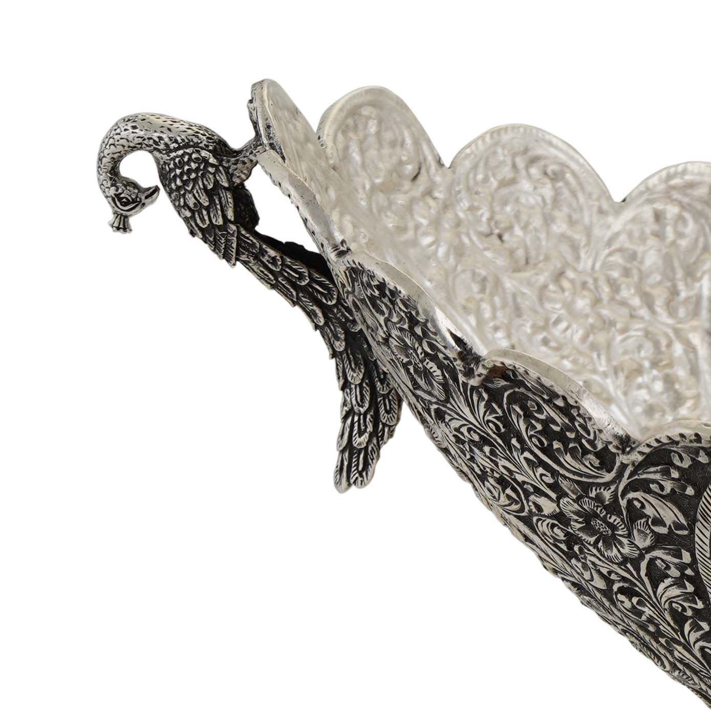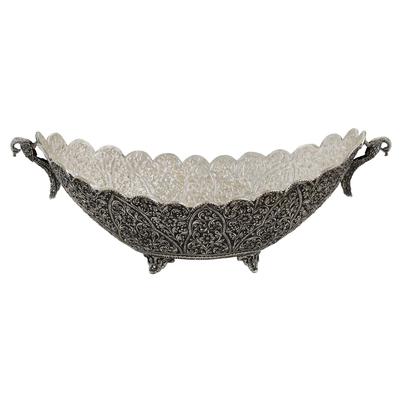 A boat shaped fruit basket with curvy peacocks to hold and little stand to lift it high. The whole basket is with asymmetrical curves on it and the entire basket in embossed with beautiful carvings of floral designs and finished with Antique Polish to it.