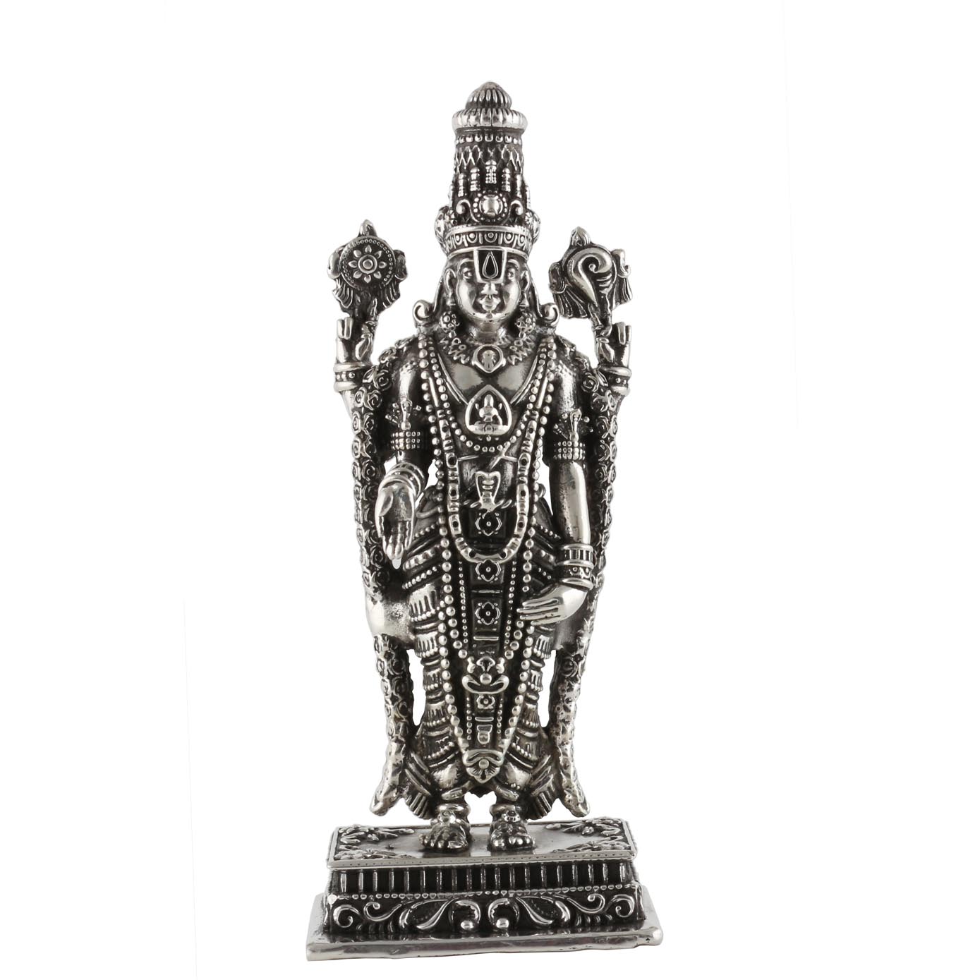 Tirupathi Elumalai venkatesha Perumal donned with all his Jewels and holding Changu Chakra in two of his hands and one hand closely holding his thighs and other with Shin Mudhra facing down.