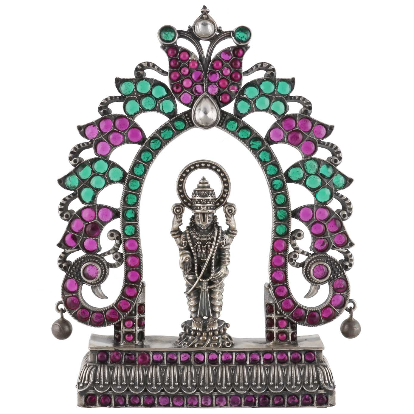 Beautifully handcrafted Yezhumalaiyan’s idol upheld with traditional kemp stones prabhavali and manae resembles the moola moorthi of yezhumala in pure antique finished silver. This idol truly deserves the centre of attraction to your pooja room.