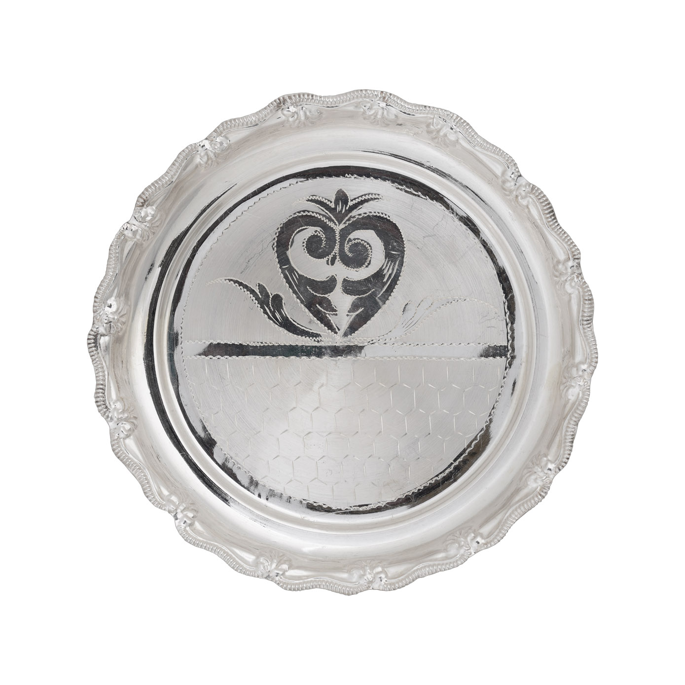 The outline of the silver plate carved with floral designs and rims on it, with the center engraved with floral design in a half and the other half with honeycomb design.