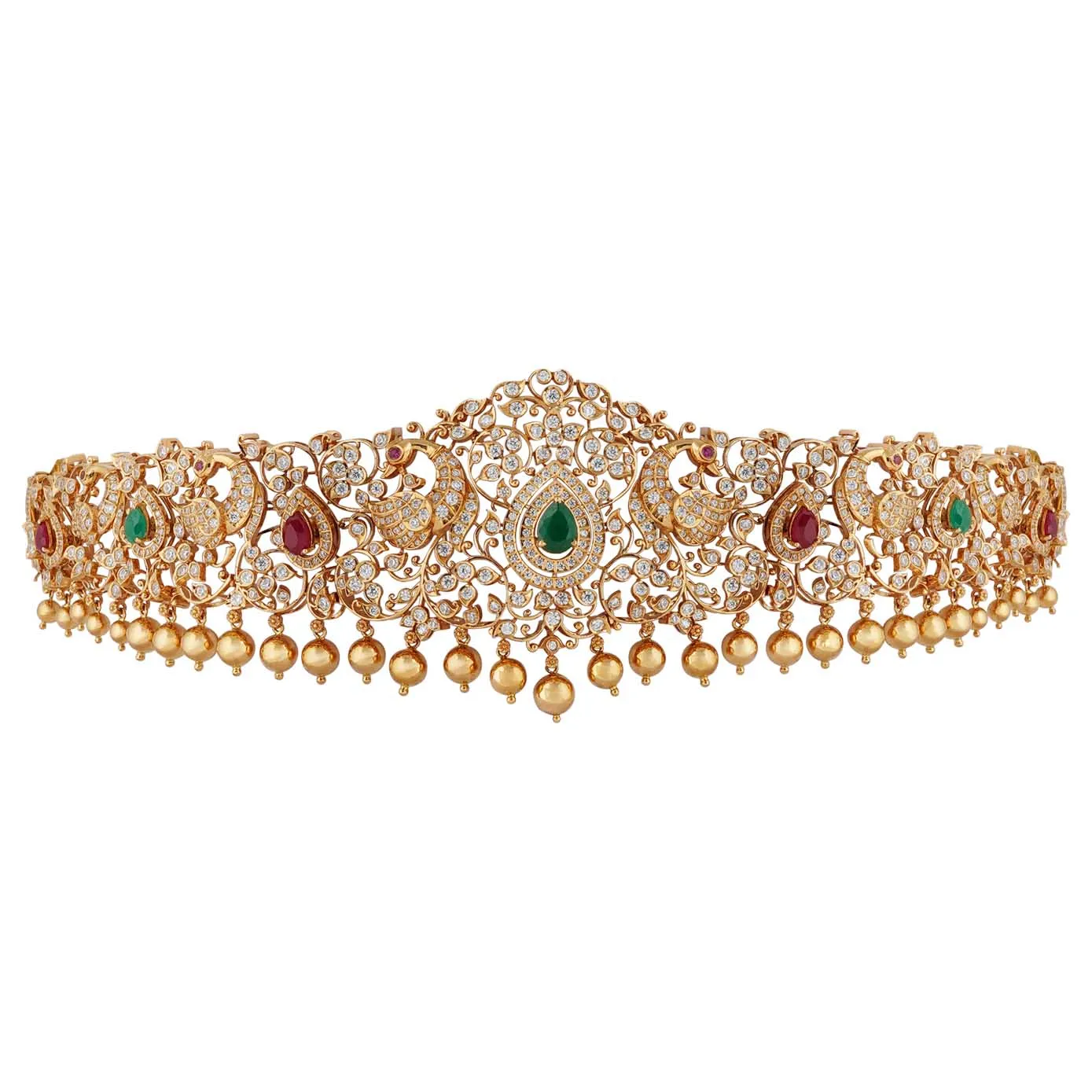 To show how thin and beautiful your waist is…and make your saree to be pleated and folded well with it. The entire Oddiyaam is designed with kundhan stones and colored stones and the color stones can be interchangeable for every central petal motif surrounded with peacocks on it. To finish the beautiful ornation it carries gold beaded droppings to it.