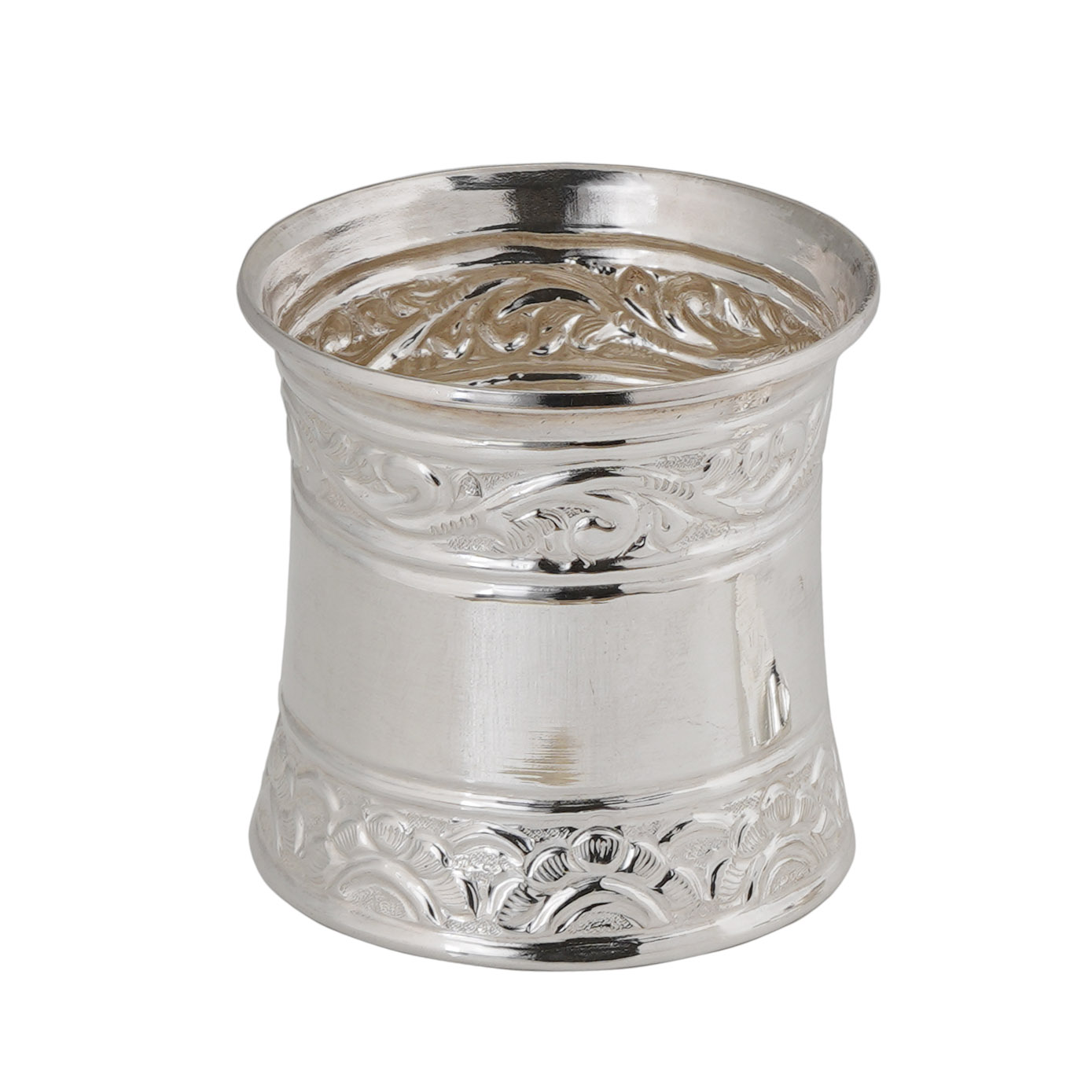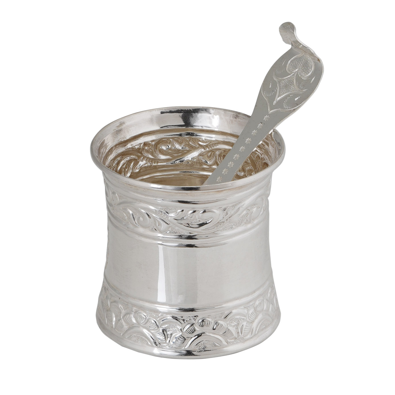 Crafted with a timeless design, this set of silver Pancha Pathram and Utharani serves as an embodiment of tradition. Fashioned from pure silver, these pieces are intended to infuse your home with a sense of divine energy. Employ this exquisite Pancha Pathram Utharani Set as an integral component of your pooja rituals and during the ceremonial act of aarti, enriching your spiritual practices with their sacred essence.
