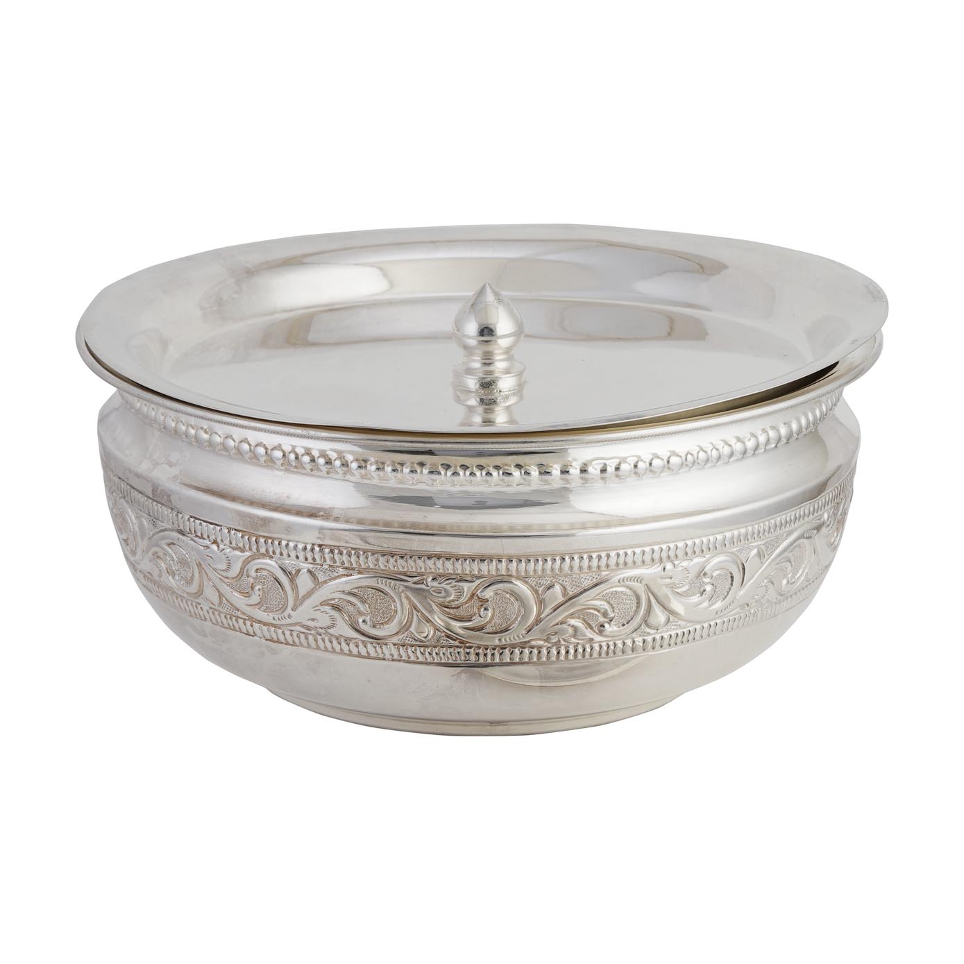 Make your Anniversary, Wedding and All Precious days make Special with this big gift , Gift is small but it will fill your life with joy. 92.5% fine silver handmade bowl kitchen set with lid, will be an excellent gifting home dining décor silver vessels, Indian opinion is silver has proven antibacterial properties. Can be paired up with heavy Annakarandi.