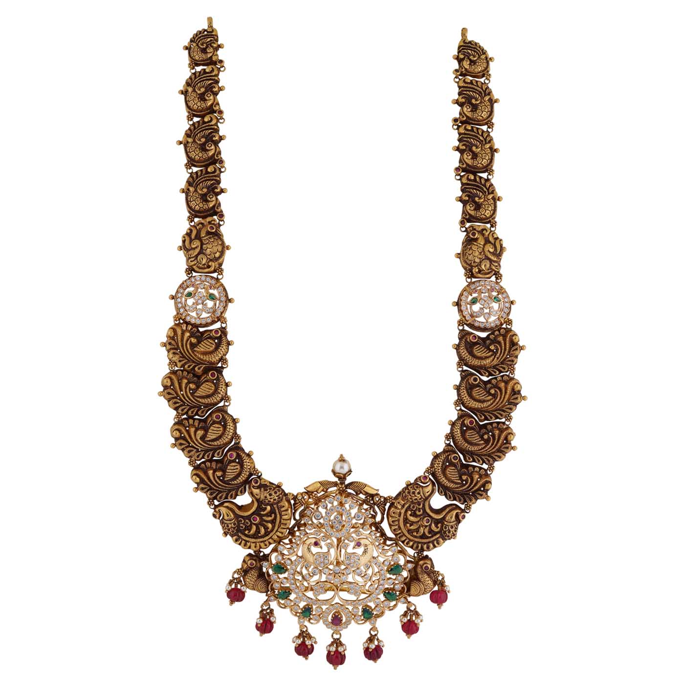 This antique haram is a mesmerizing tribute to timeless beauty. Peacocks and Annapakshis gracefully adorn the side neck layer, symbolizing grace and elegance. The haram pendant, designed in a classic manner, showcases a stunning peacock motif, meticulously studded with glistening zircons. At its heart, a touch of tradition shines through with red pumpkin beads, adorned with regal emeralds and fiery rubies, creating a rich and vibrant centerpiece. This haram is a captivating blend of heritage and artistry, making it a cherished piece that exudes both grace and grandeur.