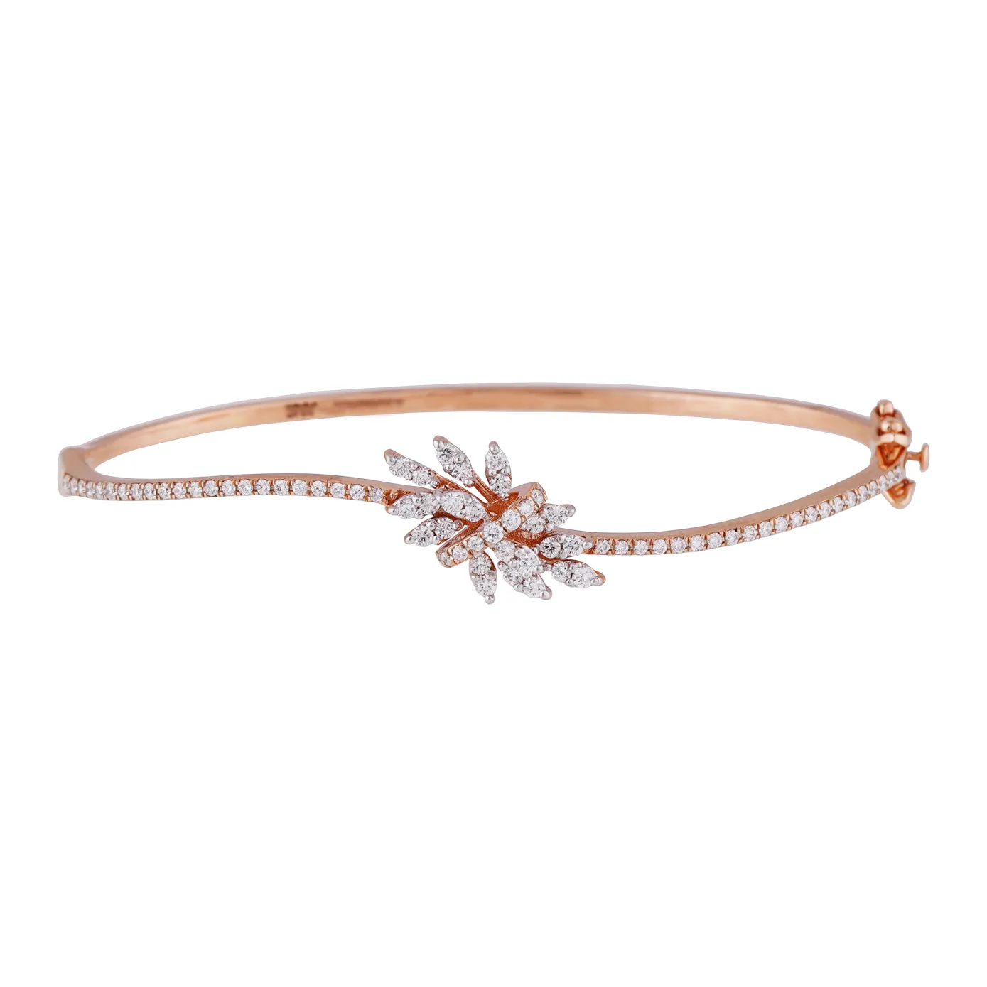 Subtle yet substantial piece of clip type 18k rose gold floral bracelet, studded with diamonds, helps you to make a bold and dazzling statement.