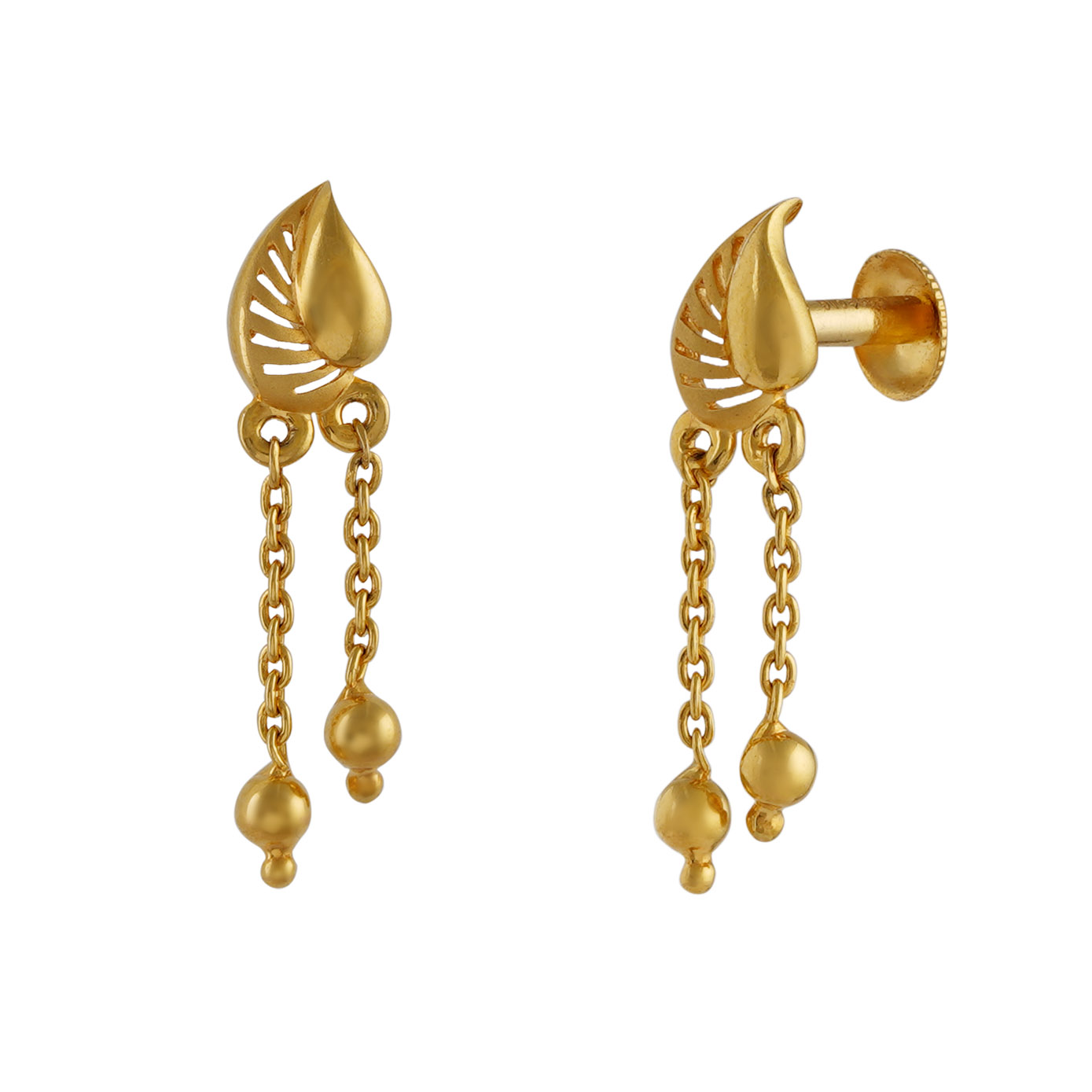 This beautiful gold earring is a celebration of nature's elegance. The stud takes the form of a delicate leaf, intricately carved to capture the essence of the outdoors. Suspended from it are two graceful drop chains, adding a touch of movement and sophistication. This earring seamlessly blends simplicity with style, making it a versatile and timeless adornment for those who appreciate the artistry of nature-inspired jewelry.