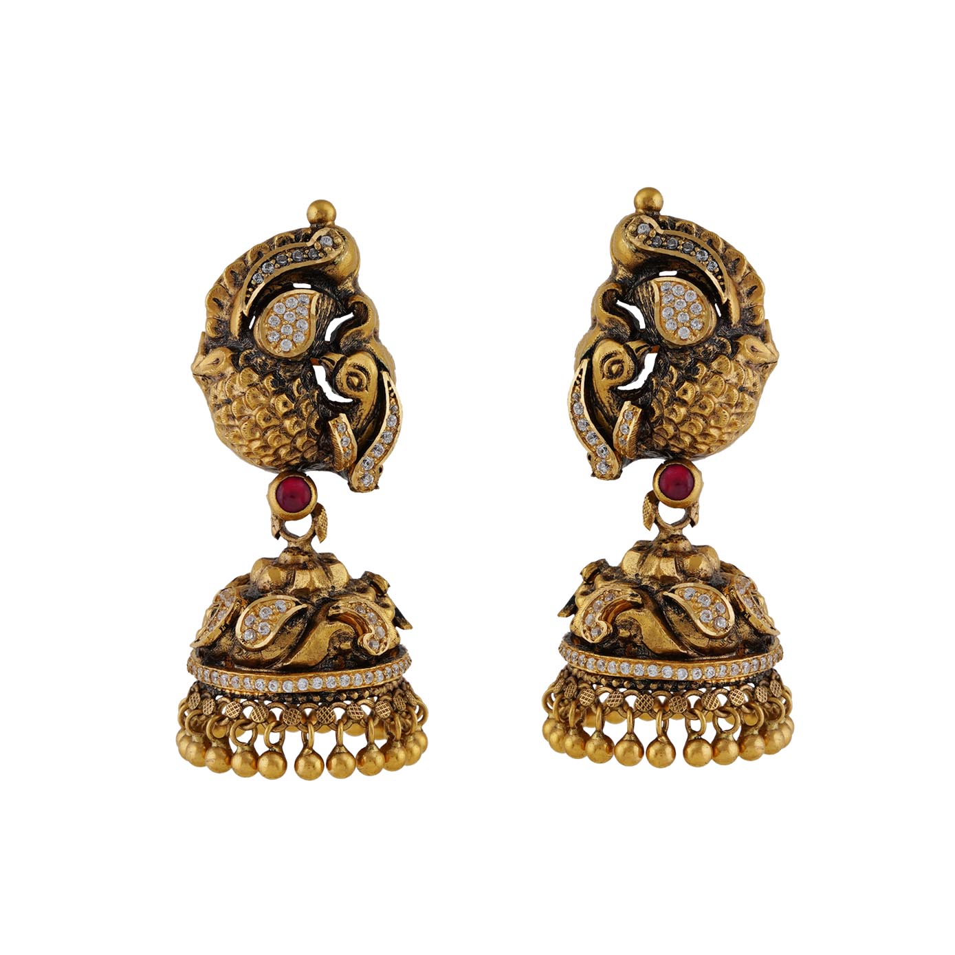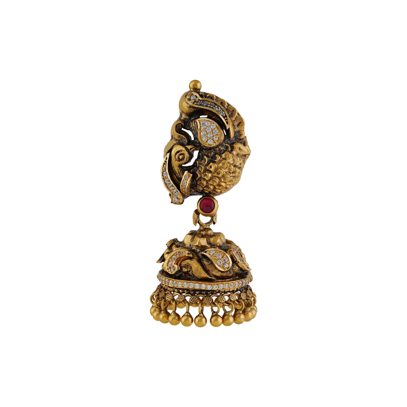 Adorn yourself in the splendor of heritage with our antique jhumka, featuring intricate peacock carvings and adorned with glistening white zircons. A timeless fusion of craftsmanship and elegance.