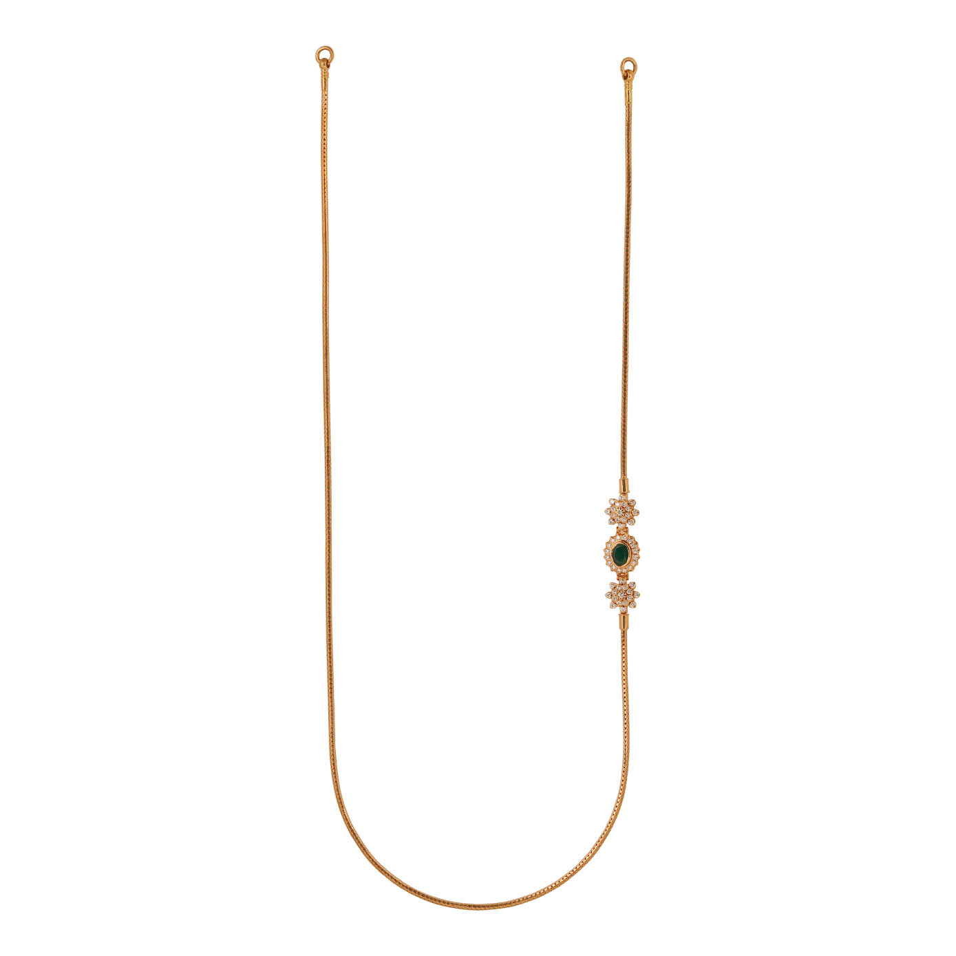 This captivating 22kt gold *mugappu* is designed in a beautiful floral pattern, exuding timeless elegance. The floral motif is intricately crafted with attention to detail, highlighting the traditional craftsmanship of the piece. At the center of the *mugappu* sits an exquisite oval emerald, radiating its rich green hue. The emerald is surrounded by a border of sparkling diamonds, adding a dazzling contrast to the deep green stone. The *mugappu* is delicately attached to the iconic ice cream *kodi*, enhancing its allure with its unique and sophisticated design. This piece is a perfect fusion of heritage and luxury, ideal for those seeking an extraordinary statement of grace and elegance.