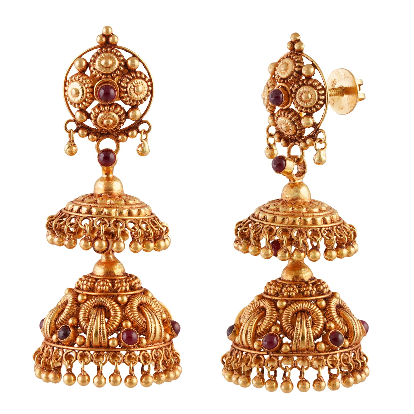 A traditional Jhumka bears the design of twisted coils at the base and tiny gold balls dangling around the rim to make soft chimes. The Kemp stones appear in between the coils to add an appealing look to this two-layered Jhumka. It is a stunning piece for classic enthusiasts.