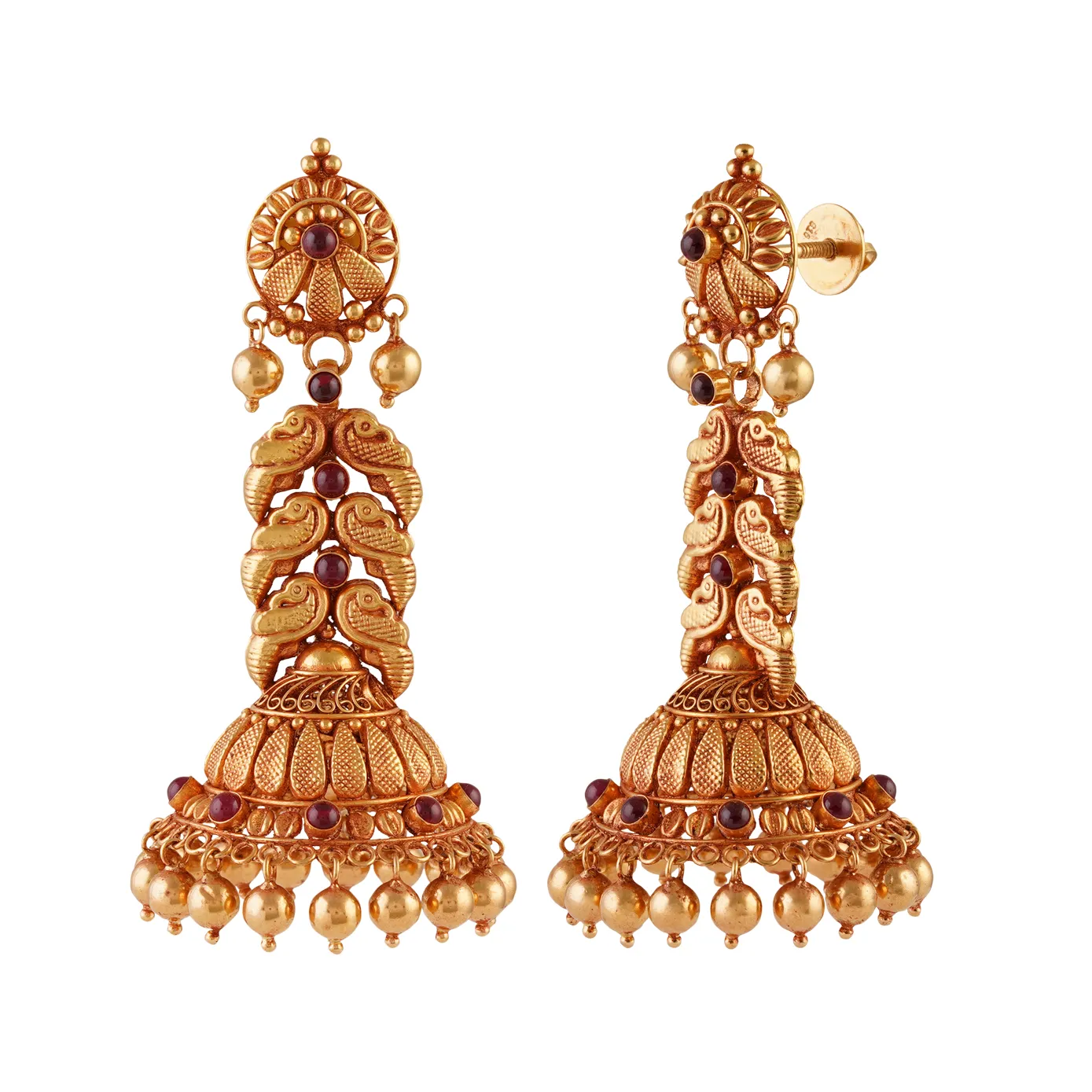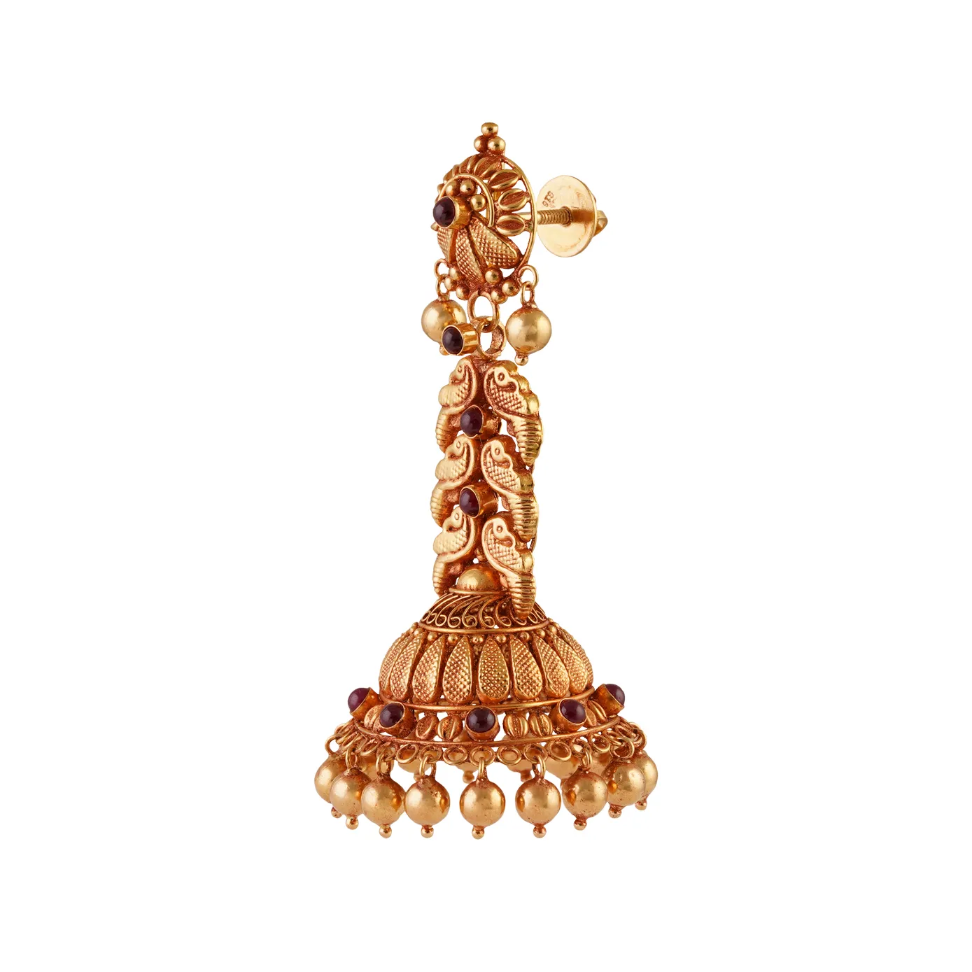 Long Jhumkas are a posh selection that emphasizes a luxury glimpse when coupled with perfect traditional wear. The enchanting peacock motif sits elegantly atop the floral dome with gold balls. The attractiveness intensifies with the presence of Kemp stones across the Jhumka.