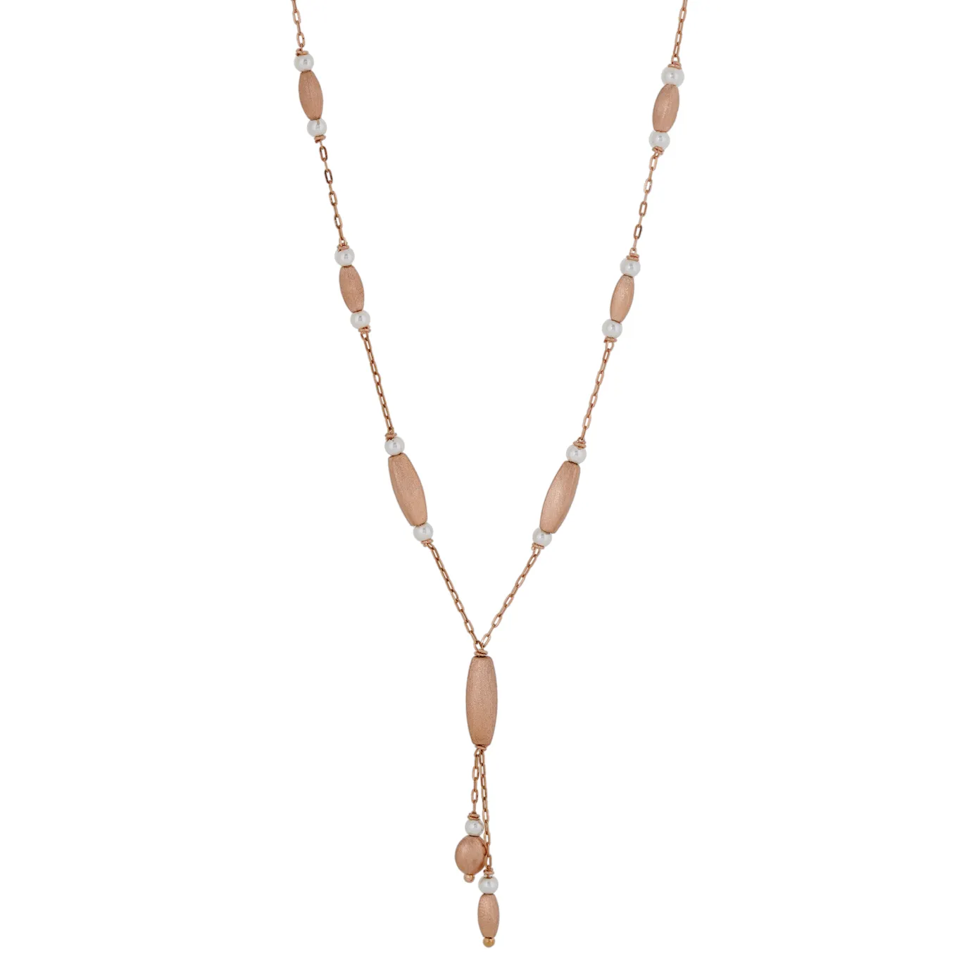 This trendy, chic sand Matt finish rice pearls made of 18k rose gold is paired up with rounded pearls, gives you a gorgeous makeover.