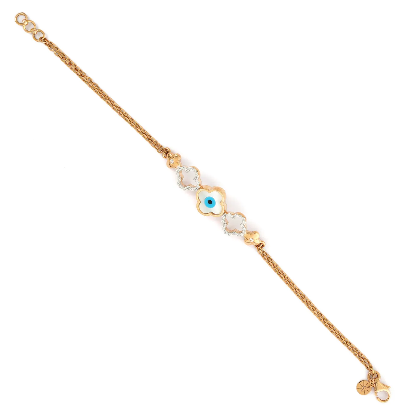 Dainty floral motifs added together, with a specialty to ward of evil eyes around you. The central flower with evil eye in it, zircons studded floral motifs fastened with cable styled chains to make it as an out standing bracelet.