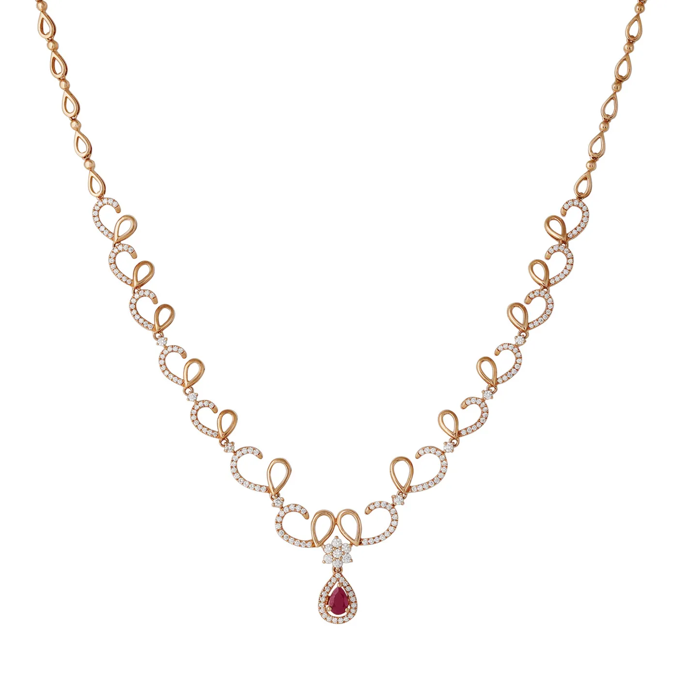 The graceful spirals of rose gold interlace seamlessly with delicate diamond accents, forming a captivating jewelry masterpiece. Infusing even more grandeur, a vivid red gemstone dangles at the heart of the necklace, enhancing its allure. This can match every outfit and all ages and if you want a mini diamond treasure to adore your darling angel daughter, then go ahead with this thread of happiness.