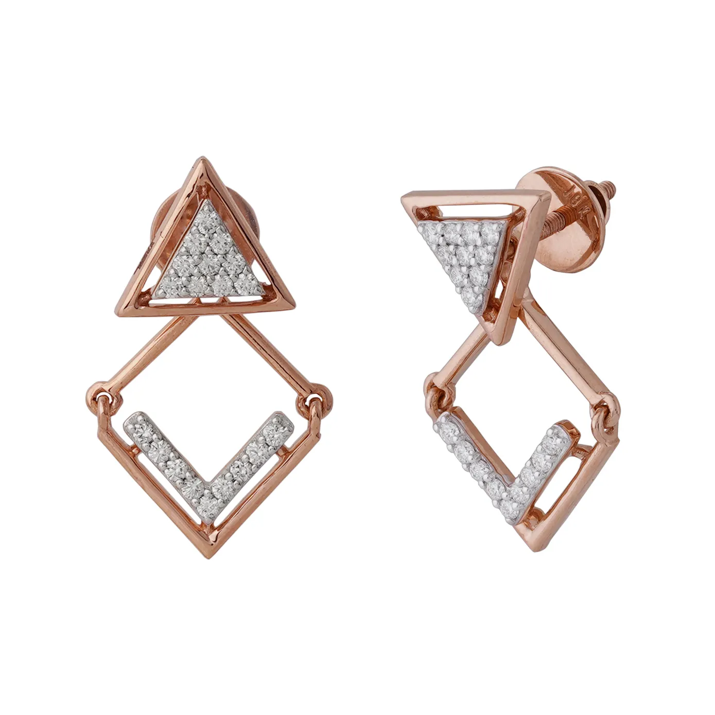 The mesmerizing brilliance of diamonds comes together in an exquisite dance upon the canvas of 18k rose gold, forming an alluring triangular composition. Each diamond is carefully positioned to create a harmonious arrangement that captures the light from every angle, casting a spellbinding radiance that effortlessly draws attention. As if orchestrating a symphony of elegance, the diamond-studded motif drop gracefully descends, enhancing the piece's allure with its intricate details. Each diamond, meticulously placed, contributes to the ensemble's dazzling character, creating an intricate interplay of light and shadow that captivates the beholder. With this jewelry, the wearer is elevated beyond the realm of mere adornment. They step into the spotlight as a true connoisseur of fashion, embracing an exclusive identity that reflects their appreciation for beauty, craftsmanship, and the allure of fine diamonds set in the timeless elegance of rose gold.