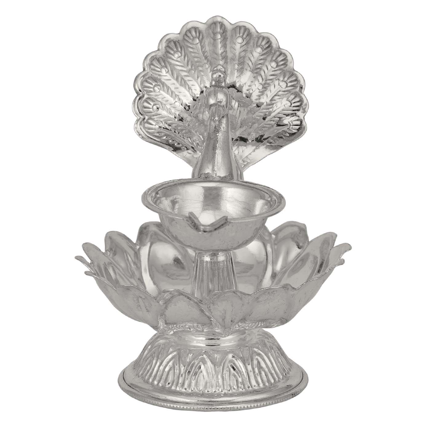 An extremely artistic two step vilaku, first step is designed as a fully bloomed lotus with inverted cup carved with beautiful detailing. An astounding peacock is standing to guard the diya.